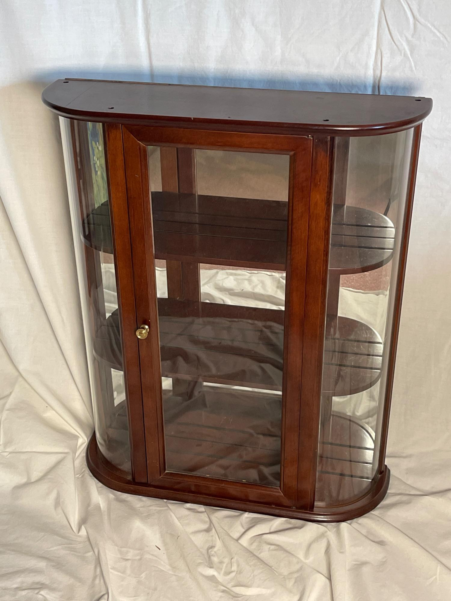 Elegant wooden curio cabinet designed for wall display, featuring curved glass side panels, three interior shelves, and a glass-front door with brass knob. The sleek silhouette and rich mahogany-toned finish offer a classic way to showcase collectibles or keepsakes.