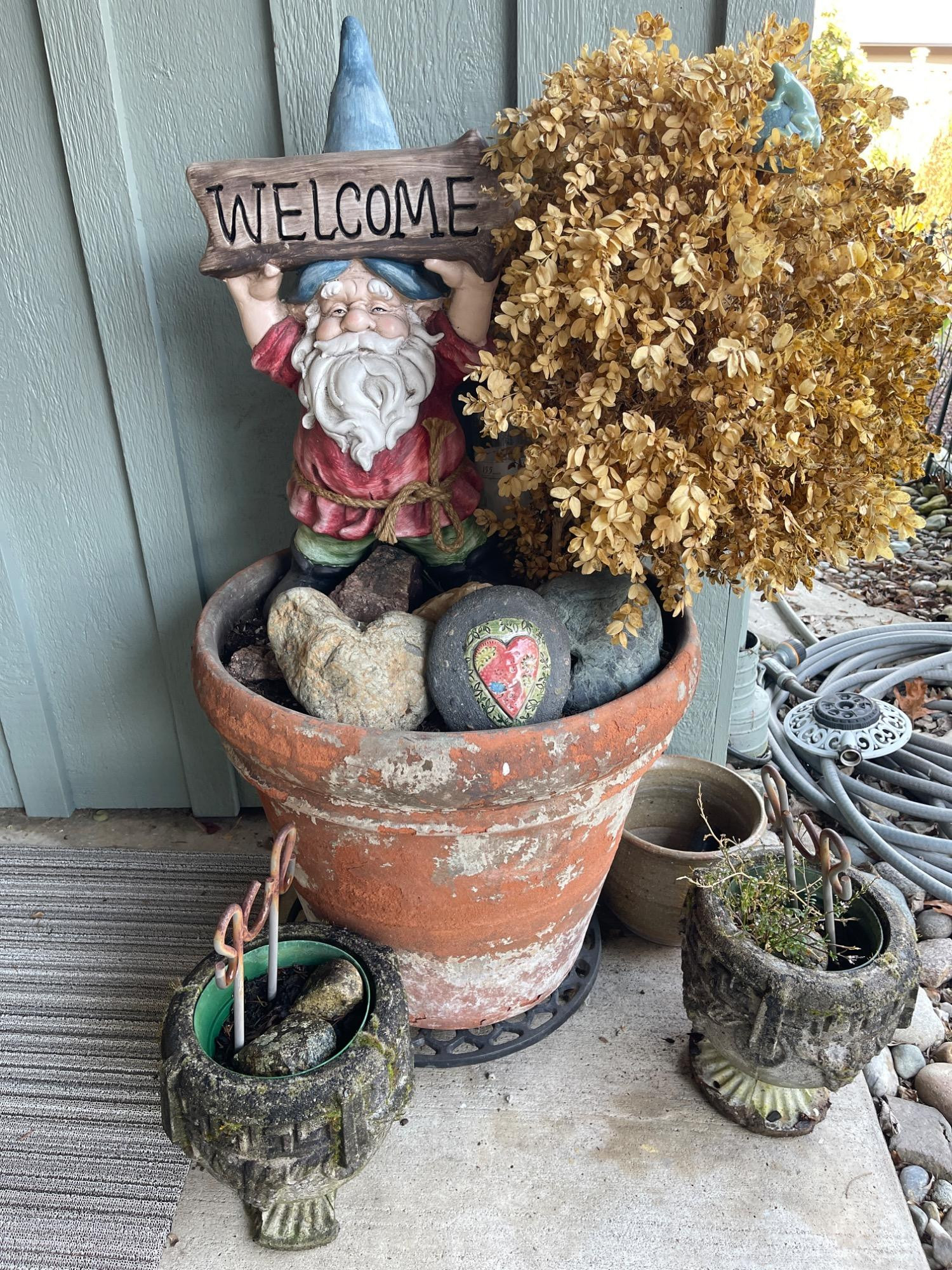Charming outdoor décor grouping including a “Welcome” gnome statue, large weathered terracotta pot with decorative rocks and dried plant, and two smaller aged concrete-style planters with metal garden stakes. Ideal for patio or garden accents with a rustic, whimsical touch.