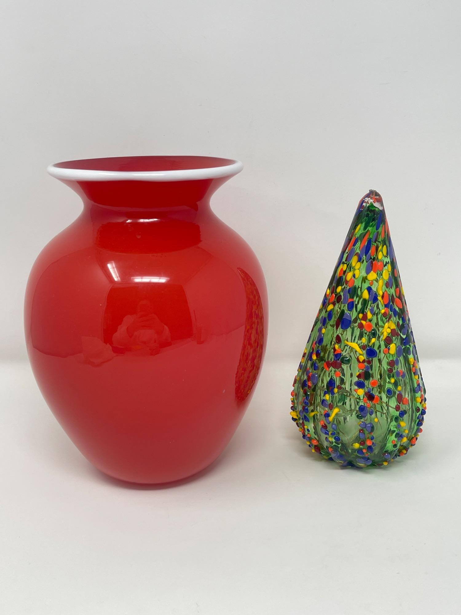 Signed Art Glass Vase (1999) & Colorful Textured Glass Tree Striking pair of decorative art glass pieces. The vase is a vivid red with white lip, signed and dated “1999” on the base. The tree-shaped piece features a green base with raised multicolor glass accents throughout and an open underside that reveals a string of lights inside.