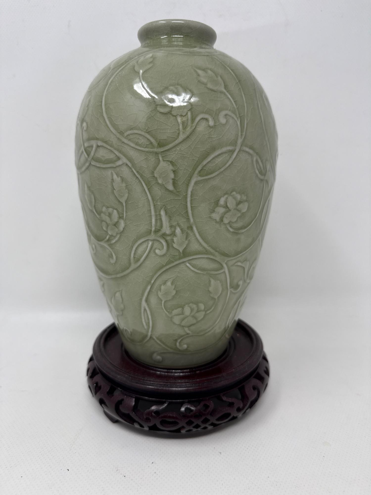 Celadon Vase with Carved Stand – Lotus Motif, Signed