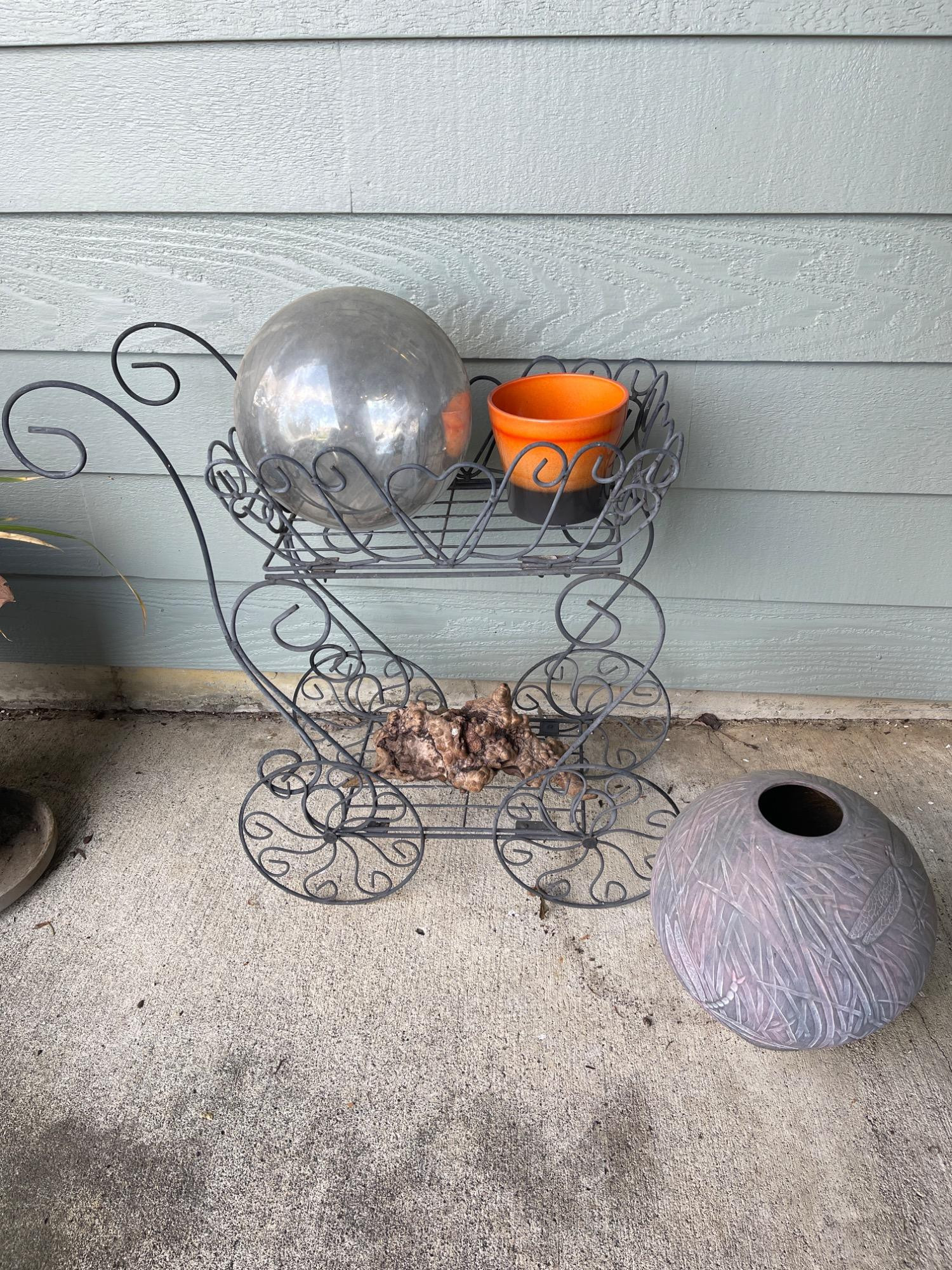 Charming outdoor display featuring a wrought iron garden cart with scrollwork design, two-tiered shelving, and functional wheels. Includes a large textured ceramic pot with incised reed motif (approx. 12" H), a reflective stainless garden orb, a glazed orange planter, and a natural wood burl accent. A decorative mix ideal for porch, patio, or garden use.