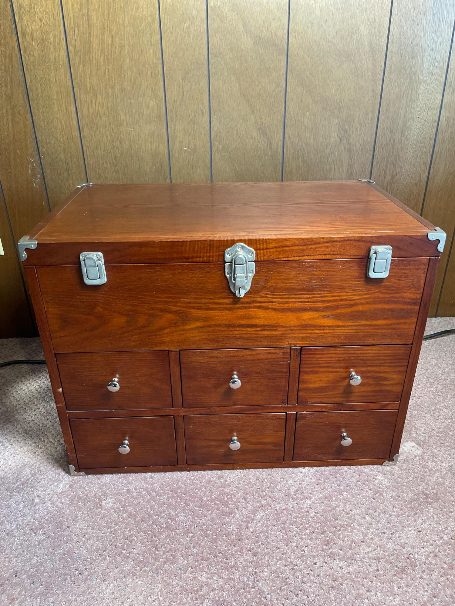 Wooden Tool Chest with Drawers – Filled with Sewing Supplies