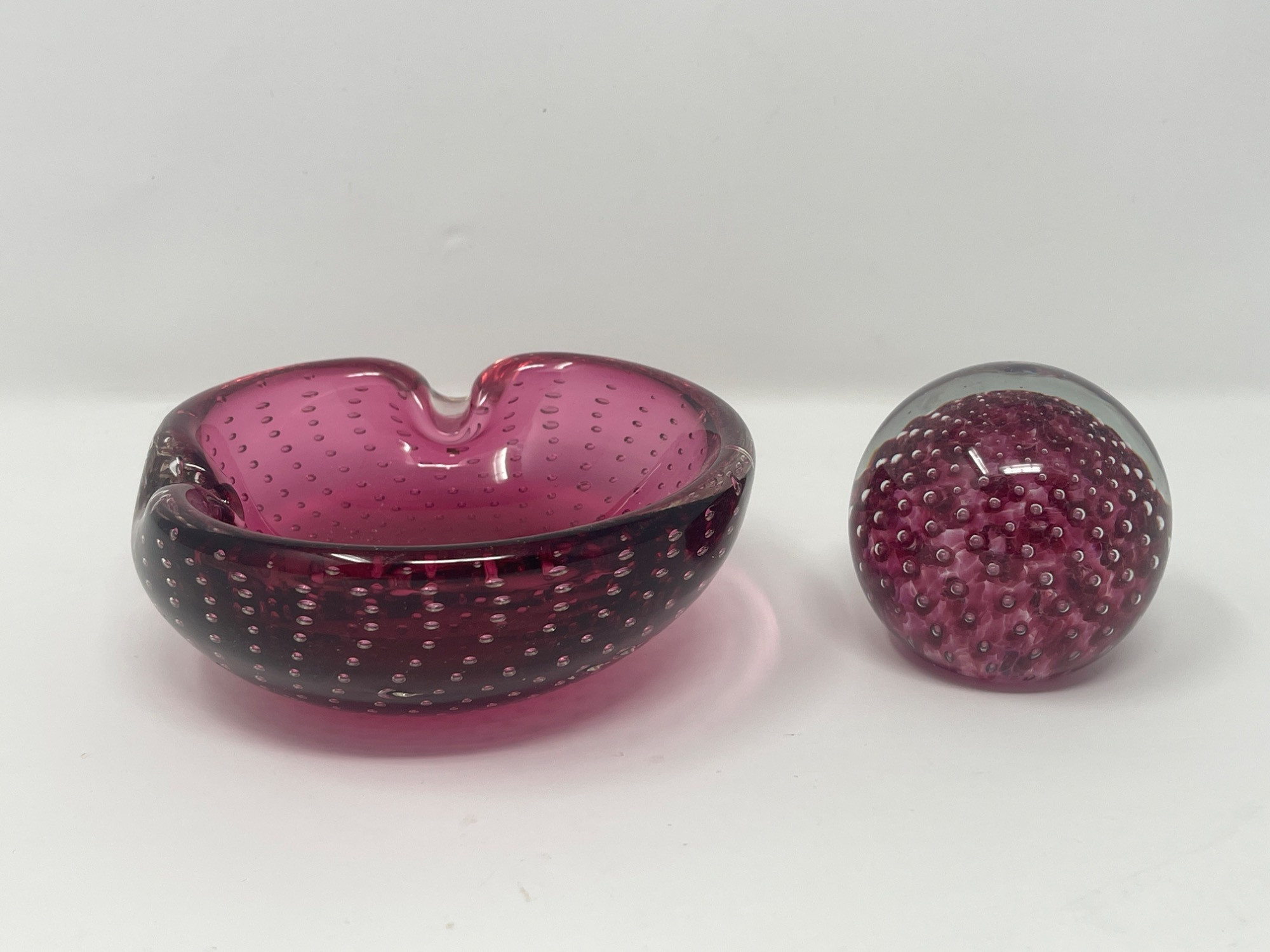 Set of two rich cranberry-toned art glass pieces, each featuring a controlled bubble (bullicante) pattern. Includes a heart-shaped ashtray bowl and a rounded paperweight signed and dated 1990. Beautiful as decorative accents or functional art glass. Condition: No imperfections noted. Measurements: Paperweight: 2.75” in diameter Ashtray: 5" W x 2" H