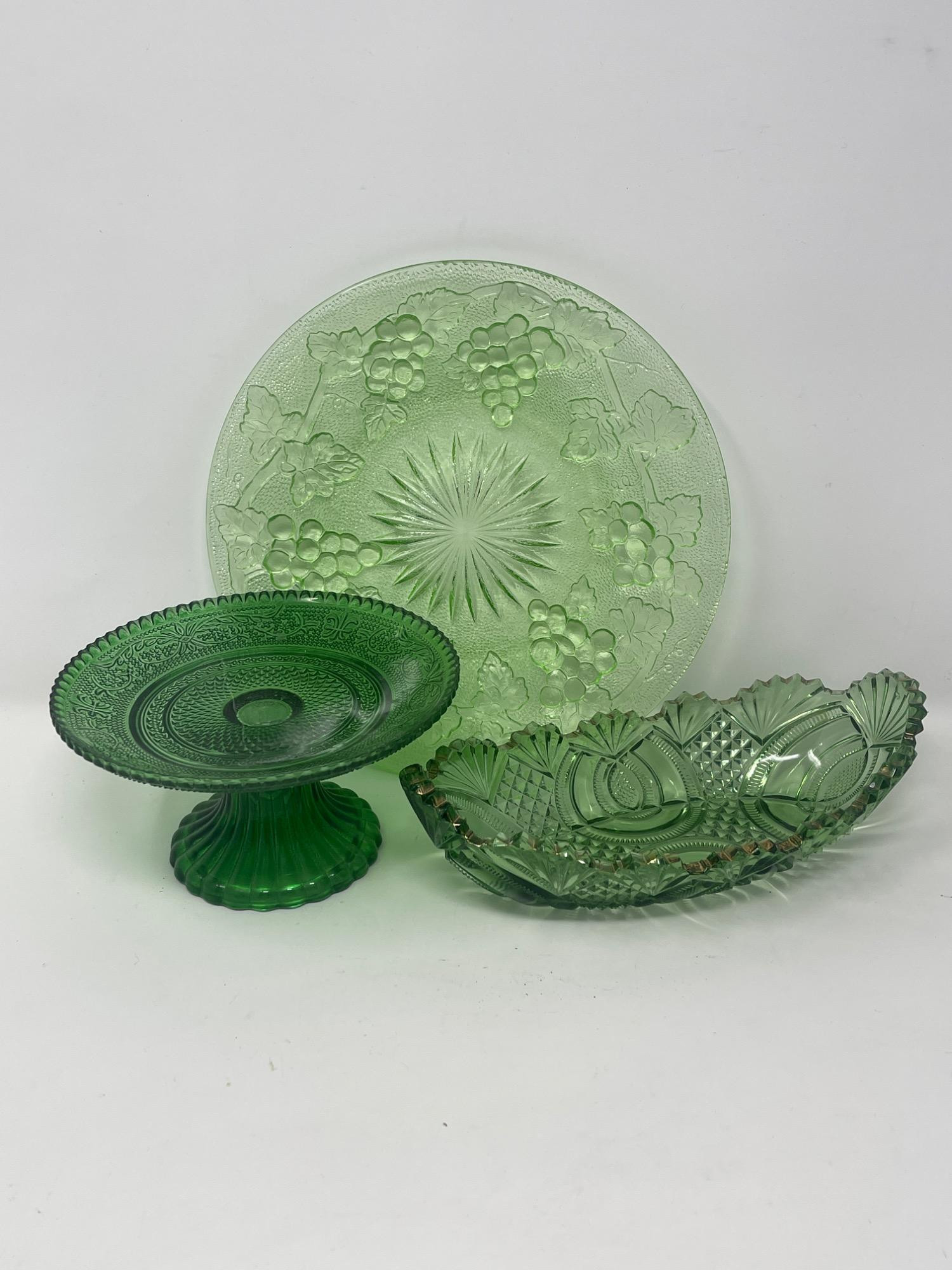Grouping of three green glass serving pieces including one uranium glass plate that glows under blacklight. The set includes a raised compote or cake stand with ornate pressed detailing, a scalloped-edge dish with deep pattern cuts, and a textured uranium glass plate featuring grapevine and leaf motifs.