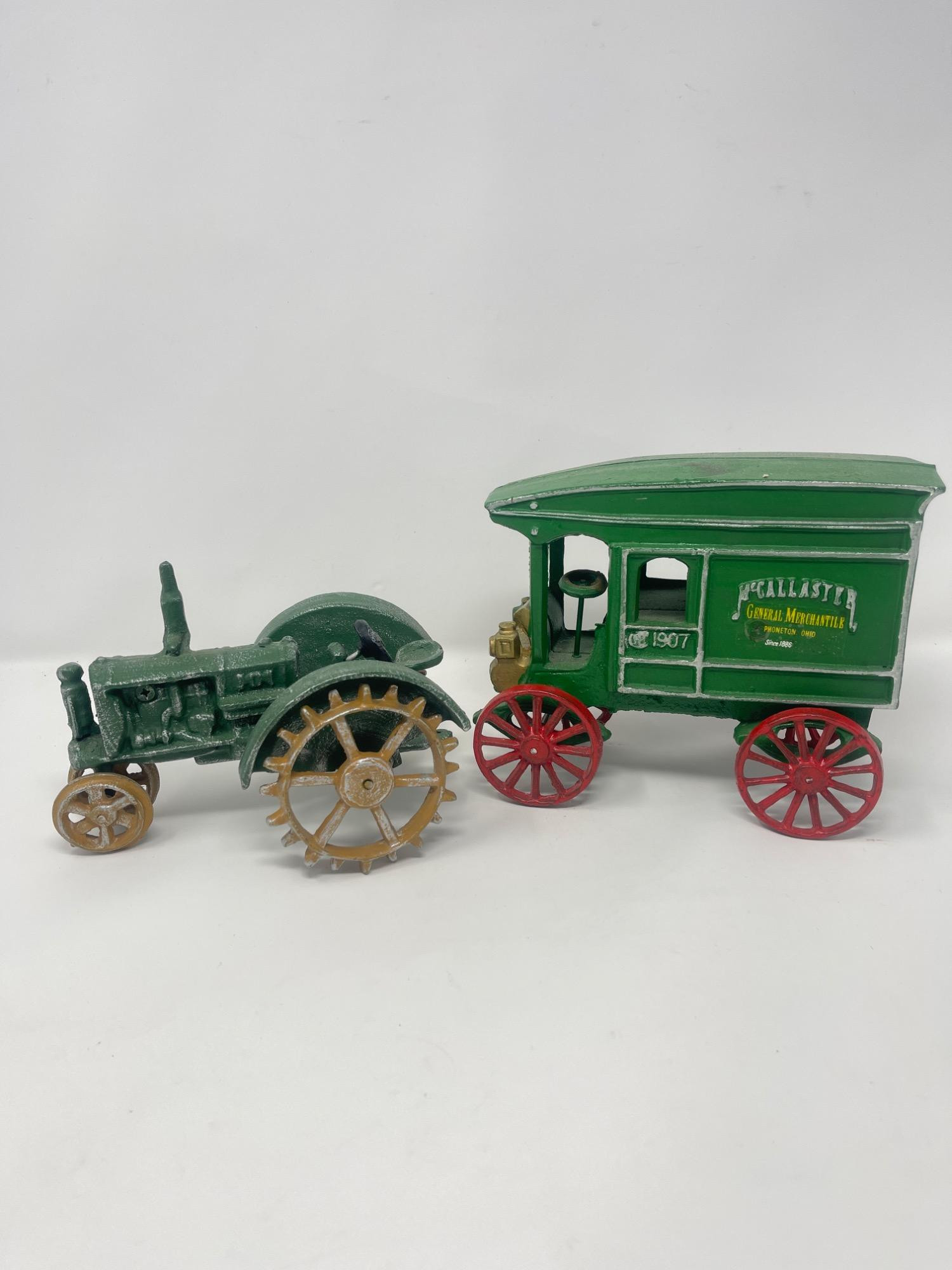 Pair of painted cast iron collectibles featuring a vintage green tractor and a 1907-style delivery wagon labeled "McCallaster General Merchandise." The tractor includes spoked wheels and engine detailing, while the wagon features bright red wheels and a lantern accent. Both have a charming, antique-inspired finish with purposeful distressing for a rustic look.