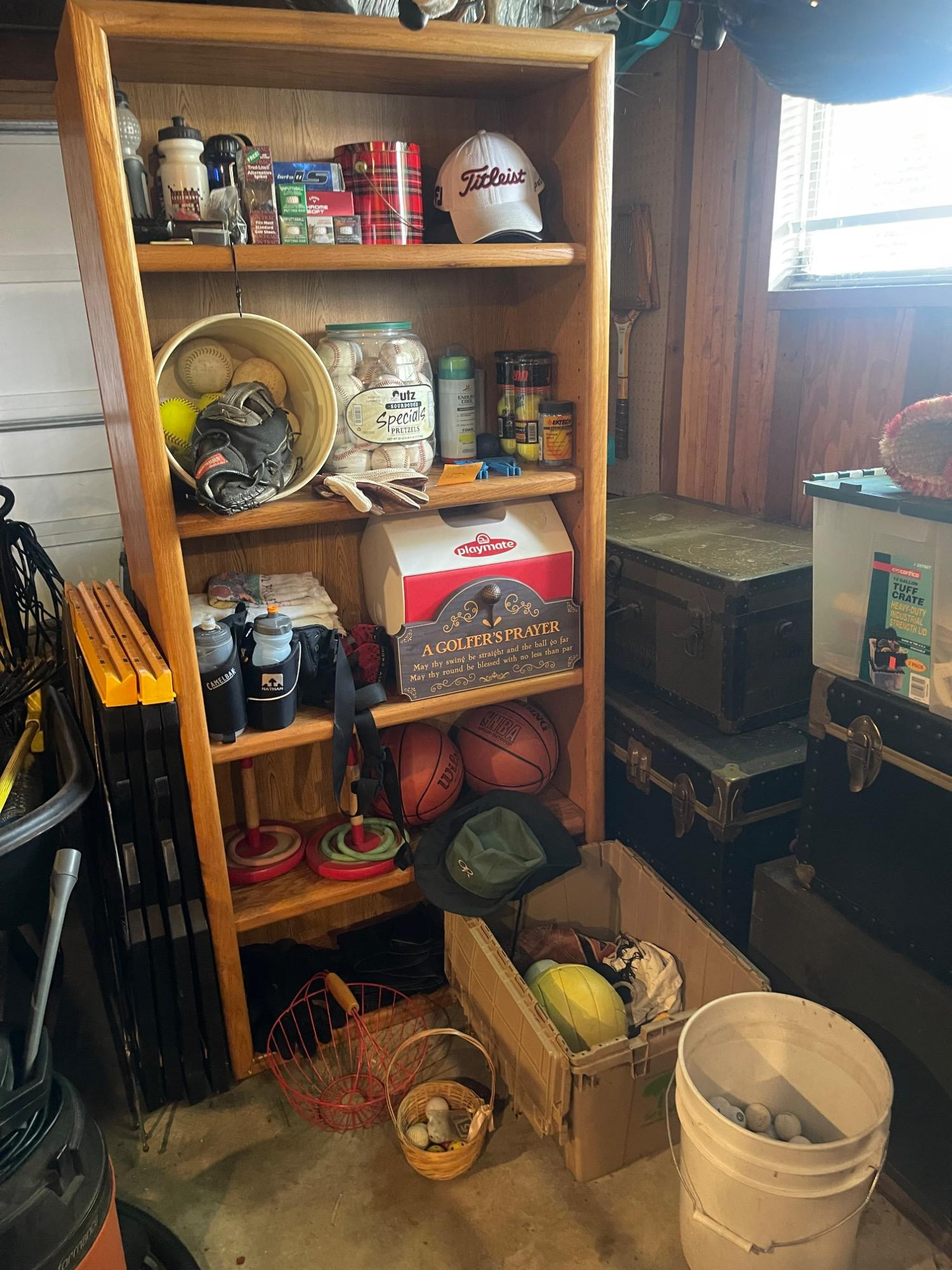 Tall wood shelving unit filled with a variety of recreational and sports gear. Contents include basketballs, baseball gloves and balls, golf balls, water bottles, resistance bands, Playmate cooler, Titleist hat, ring toss game, miscellaneous training aids, and outdoor gear. Great starter collection for backyard fun, youth sports, or general athletic use.