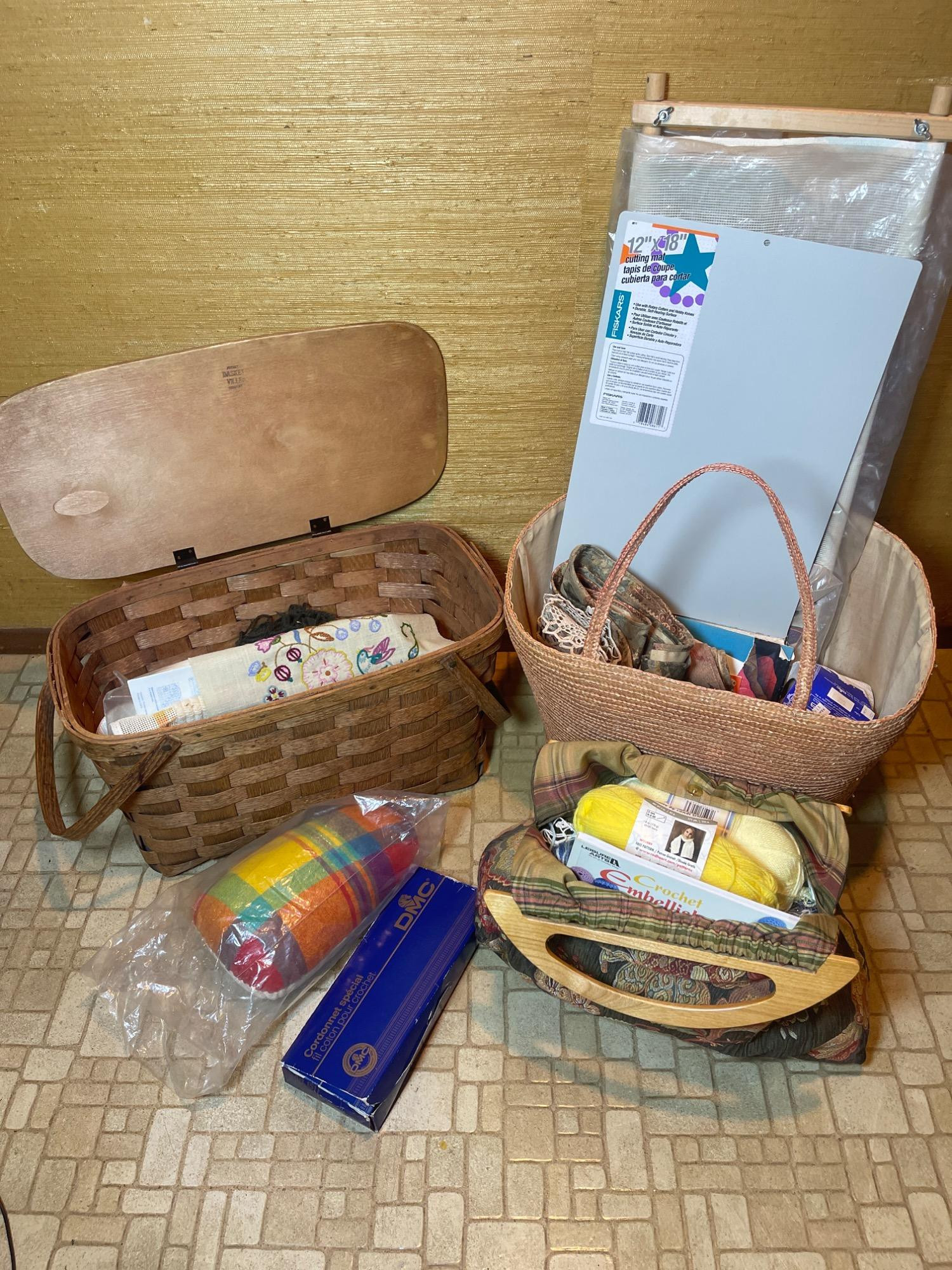 Assorted Sewing & Crochet Supply Assortment Collection of crafting supplies including sewing and crochet essentials. This lot features multiple storage baskets—one woven with a hinged lid, a handled fabric tote, and an open-weave basket—each filled with various materials. Contents include embroidery floss, crochet hooks, yarn, fabric, a latch hook canvas, and more. Great starter or restock lot for needlework and fiber art enthusiasts.