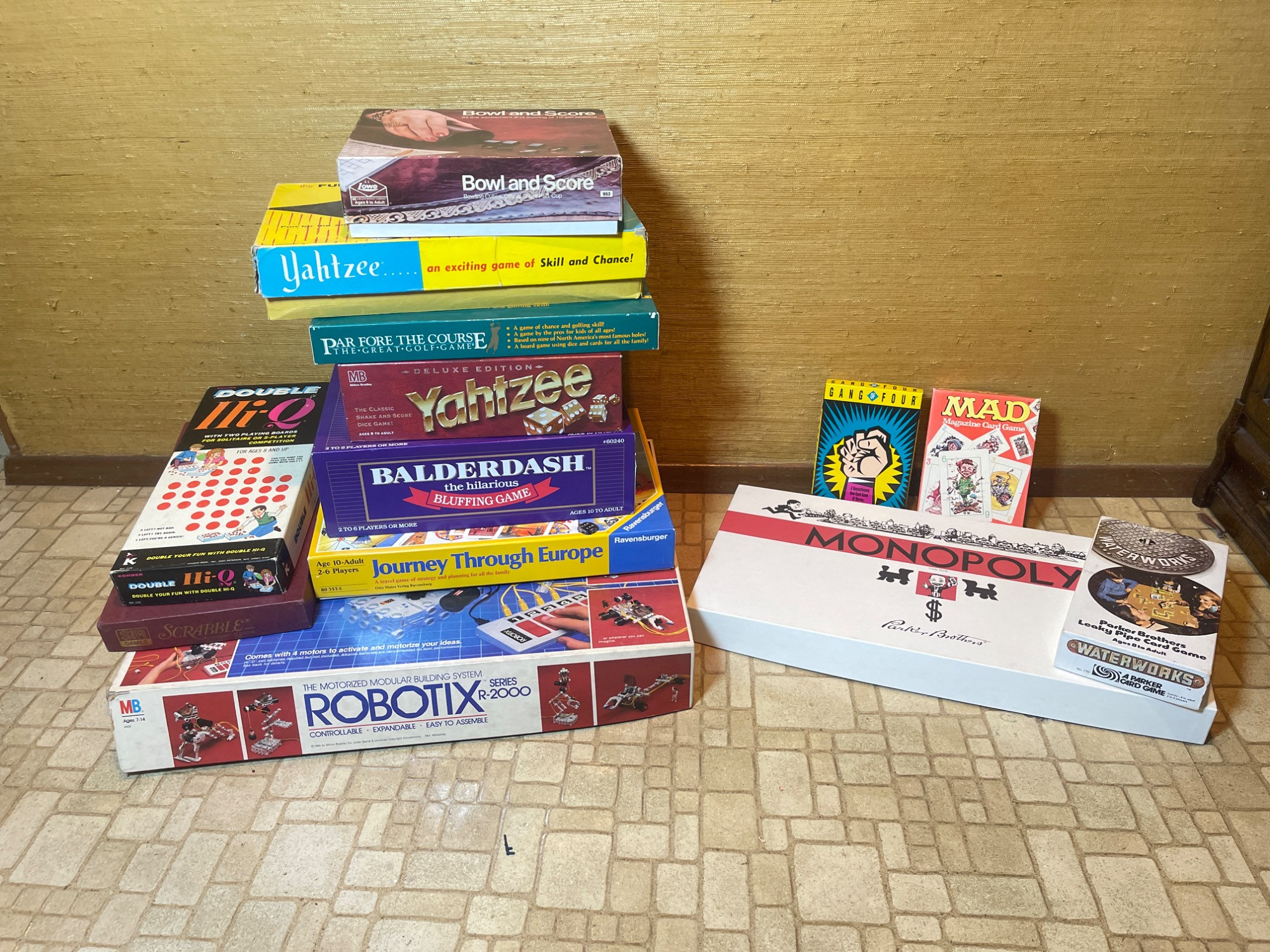 Assorted Board & Card Games Collection of classic and vintage board and card games including titles like Monopoly (Parker Brothers edition), Yahtzee, Scrabble, Balderdash, Mad Magazine Game, Waterworks, and more. Includes a Robotix R2000 modular building system. All appear to be very complete, but contents have not been inventoried or confirmed. Contents of Monopoly are unopened.
