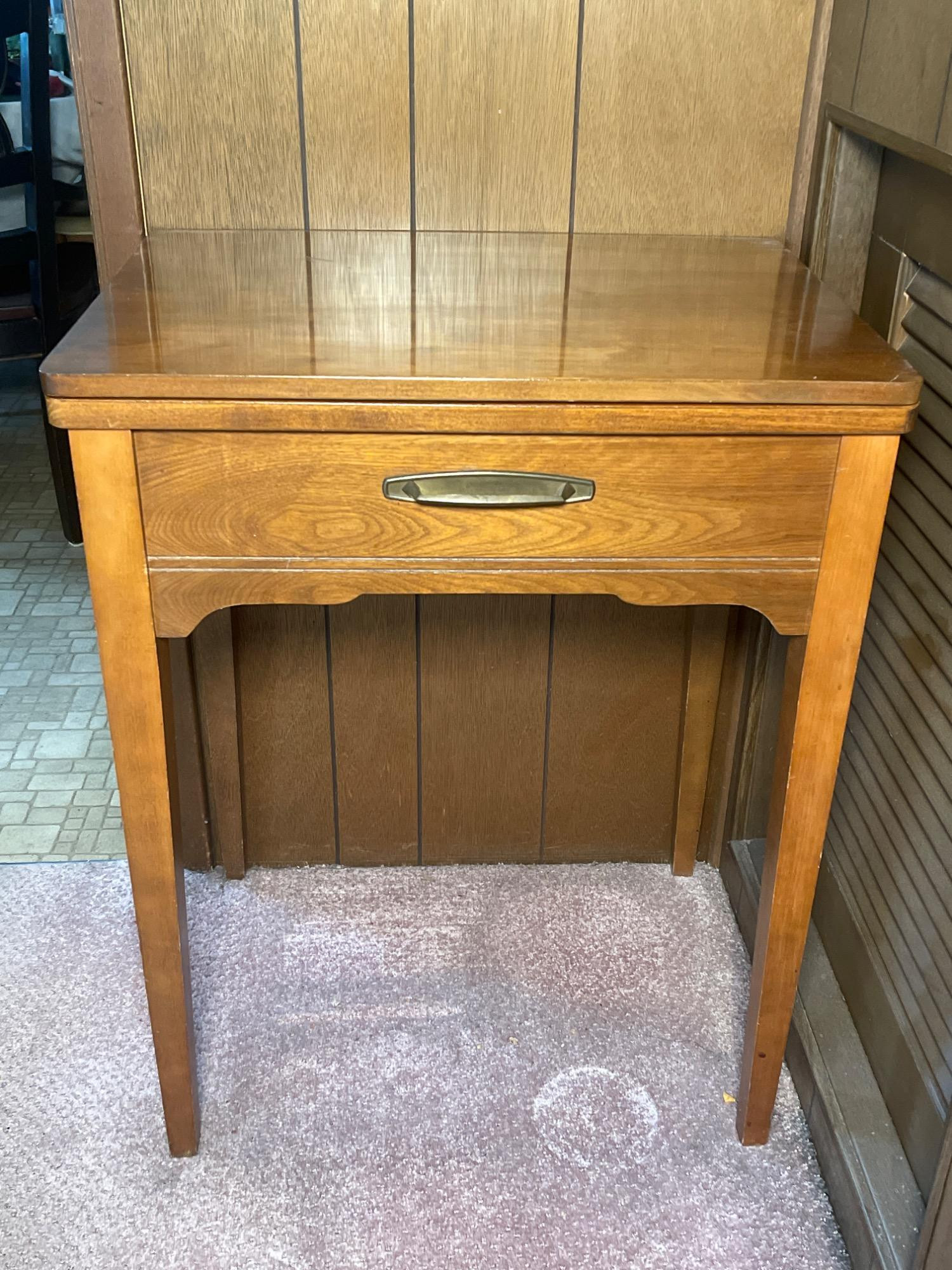 Singer Sewing Machine in Cabinet Table Singer sewing machine, built into a wood cabinet with a hinged top for easy access. The machine features a retro metallic faceplate, multiple stitch options, and dials for thread tension and length adjustment. The cabinet is finished in a warm medium-tone wood, designed to blend with mid-century or traditional interiors. Condition: Minor surface wear to cabinet; sewing machine is untested.