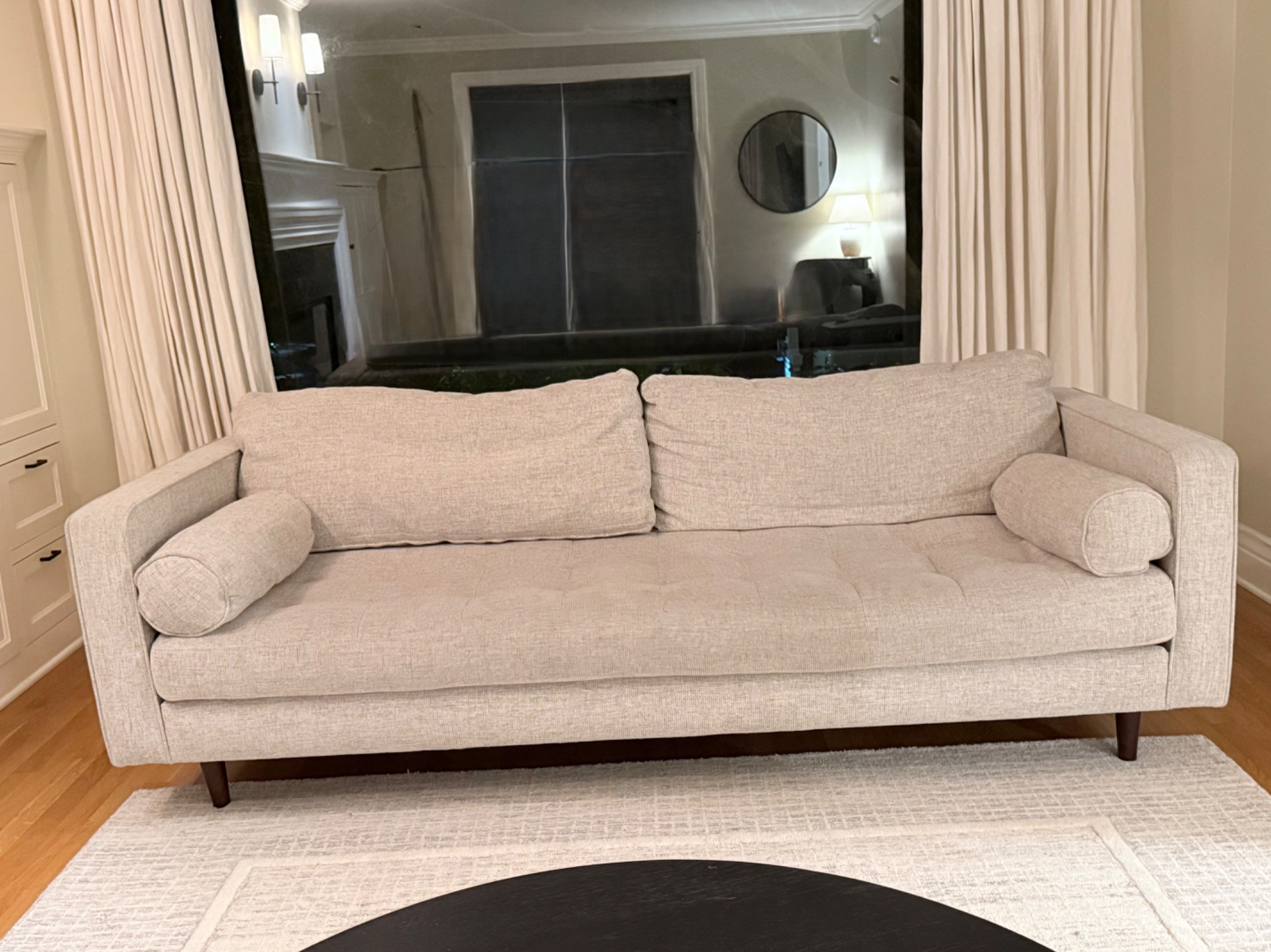 Description: Perfect for contemporary, minimalist, or mid-century modern interiors, this piece brings style and comfort to any living space. Details: Color: Light gray Material: Woven fabric upholstery Style: Mid-century modern Features: Tufted seat Two removable back cushions Two bolster pillows Tapered wood legs Condition: Excellent pre-owned condition with minimal signs of wear; clean and from a smoke-free home