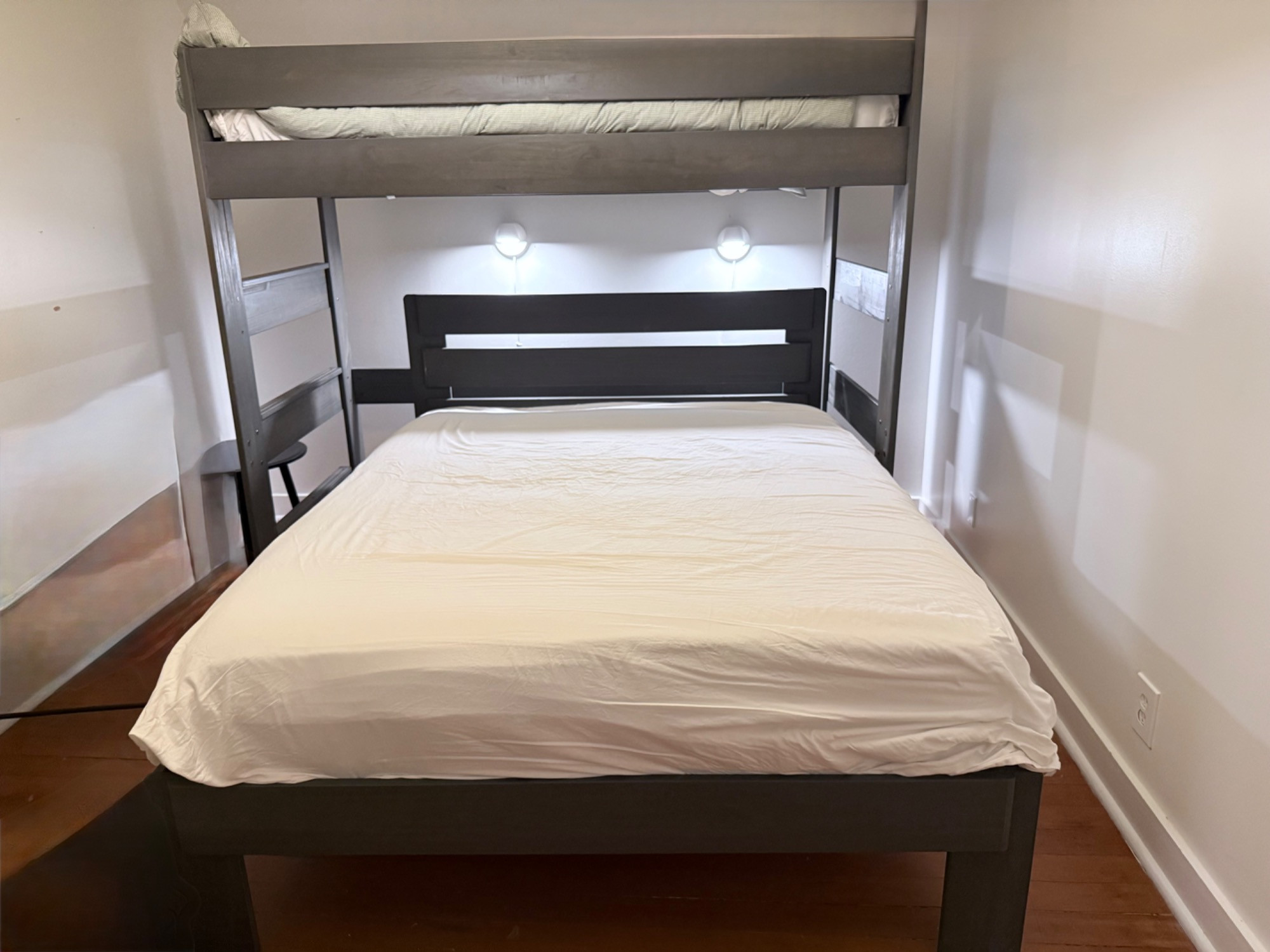 Description: Details: Configuration: Twin bed (top) over full/double bed (bottom) Material: Solid wood with painted gray finish Features: Integrated side ladder Slatted headboard and footboard design Sturdy construction with secure guardrails on top bunk Condition: Excellent pre-owned condition with minimal wear Mattresses: Included. Protected with a mattress cover (not included). Some discoloration, shows gentle use. ***Please note you will need to bring the tools to take this bed apart. You will need to disassemble the beds to get down the stairs due to size. Please bring enough help to ensure you can carry the bed down the stairs.