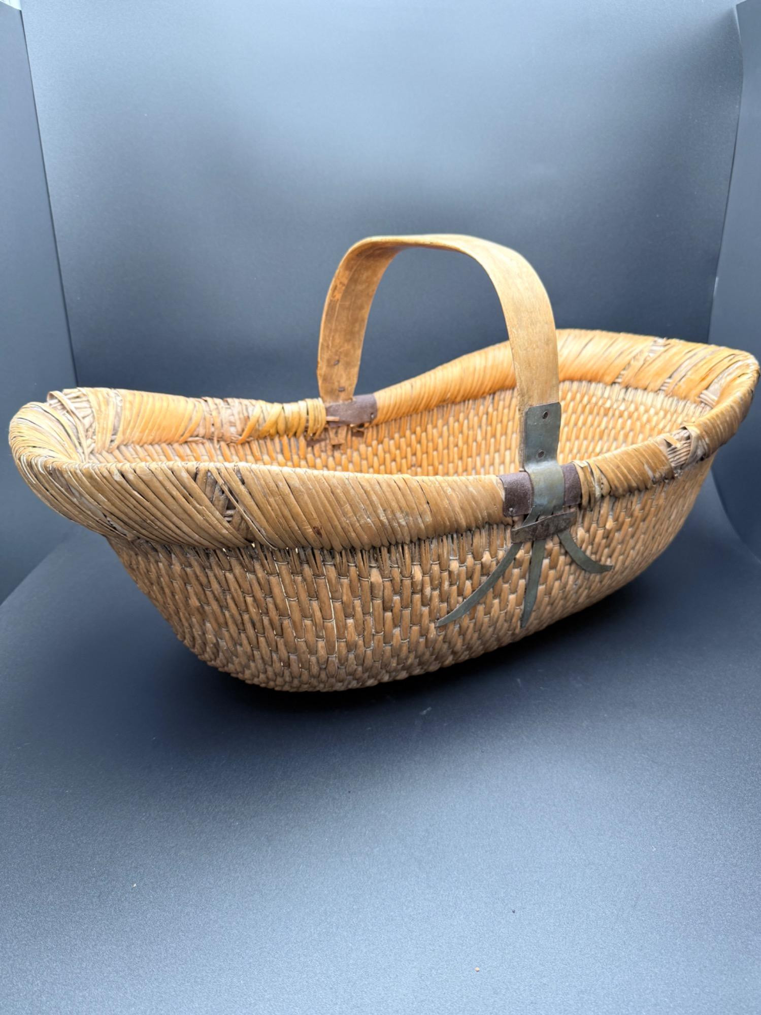 Measures- 13” W x 26” L x 13” T Add a touch of rustic charm to your home with this mid-20th century woven willow basket, a piece rich in history and functionality. Crafted in China, this beautifully designed basket showcases traditional craftsmanship with its woven willow structure and an elegant curved elmwood handle secured by hand-forged iron straps. Perfect for decor or storage, this piece whispers tales of its past life, when it was used to transport food from the fields or clothing on laundry days. Bring this rare find into your home, where it can serve as a decorative centerpiece or practical storage solution for blankets, magazines, or other household items. This authentic Chinese vintage basket carries the spirit of mid-century practicality and rustic elegance. Condition: some sections of the weaving are worn, please see pictures for more detail.