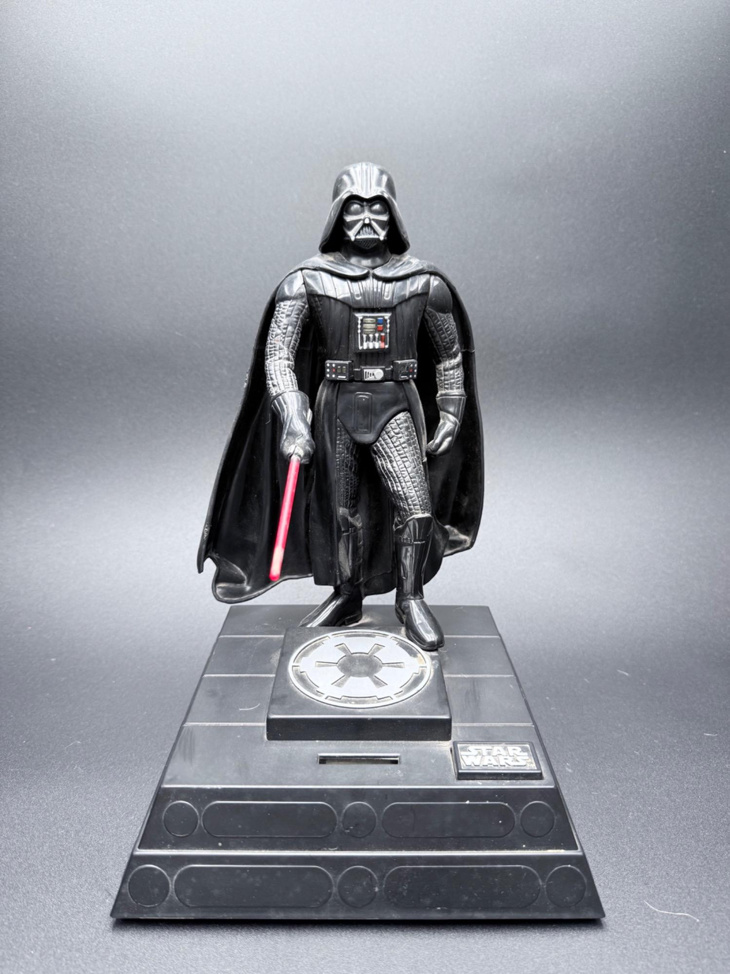 Darth Vader Talking Piggy Bank – Electronic Star Wars Collectible Add some galactic flair to your savings with this electronic Darth Vader piggy bank! Standing at 12 inches tall, this collectible features motion and sound — when you press the Star Wars button, Vader swivels and speaks iconic phrases from the films. Details: Character: Darth Vader Functionality: Swivels and talks with sound effects Coin Slot Location: On the base Dimensions: 12” tall x 7.5” x 7.5” base Battery operated (compartment located underneath) Condition: used condition with minor wear on base