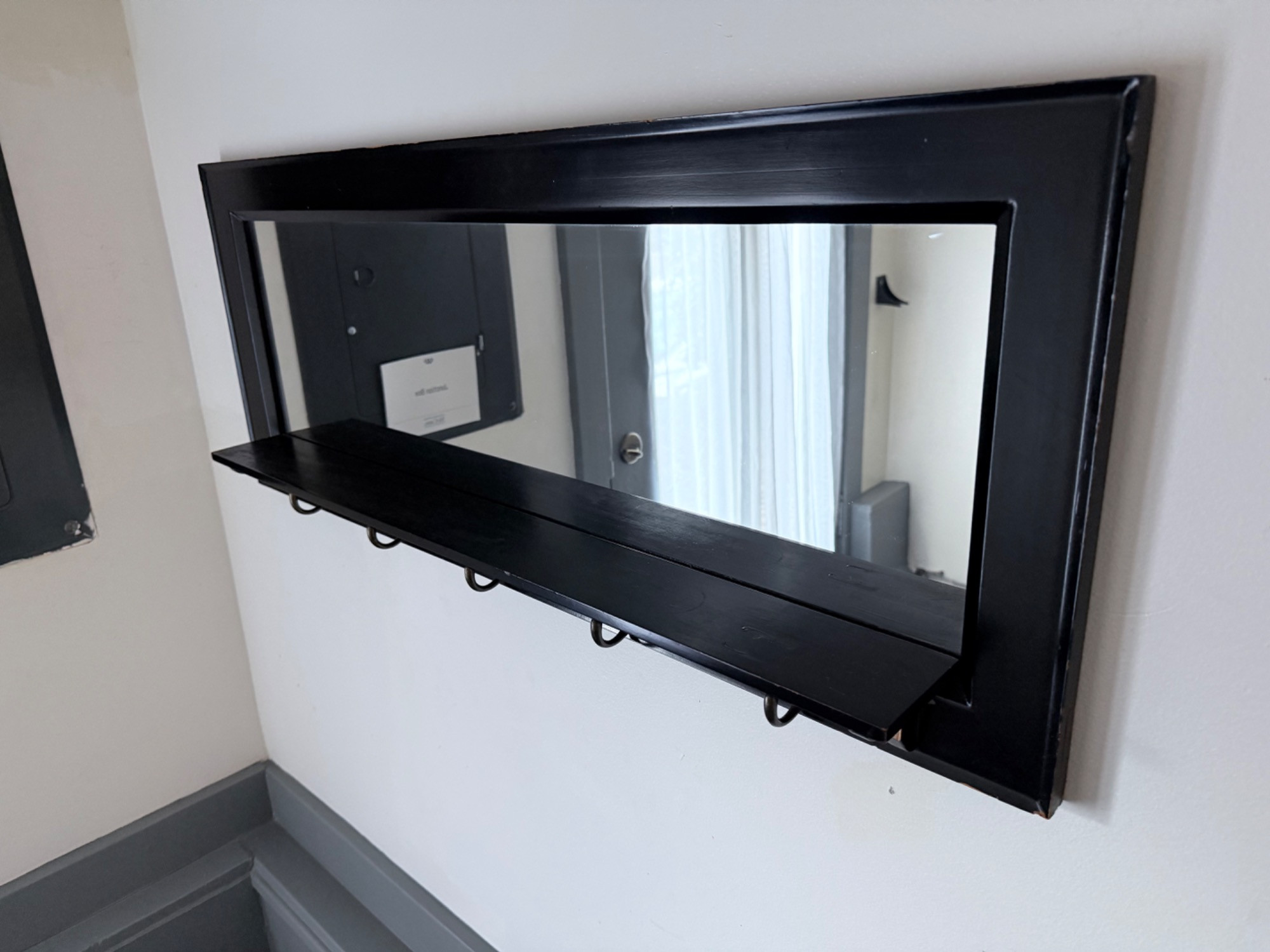 Wall Mirror with Shelf & Hooks – 36” × 14” – Black Wood Frame Functional wall-mounted mirror with built-in shelf and five hooks—ideal for an entryway, hallway, or mudroom. The black wood frame has a clean, modern style, and the mirror provides good reflection with minimal wear. Details: Dimensions: 36" wide × 14" tall Material: Wood frame (painted black) with glass mirror Features: Narrow display shelf 5 metal hooks underneath for keys, bags, or accessories Condition: The shelf has a broken wooden piece underneath (visible in photos). Shelf still holds. Light scuffing or wear to frame consistent with use