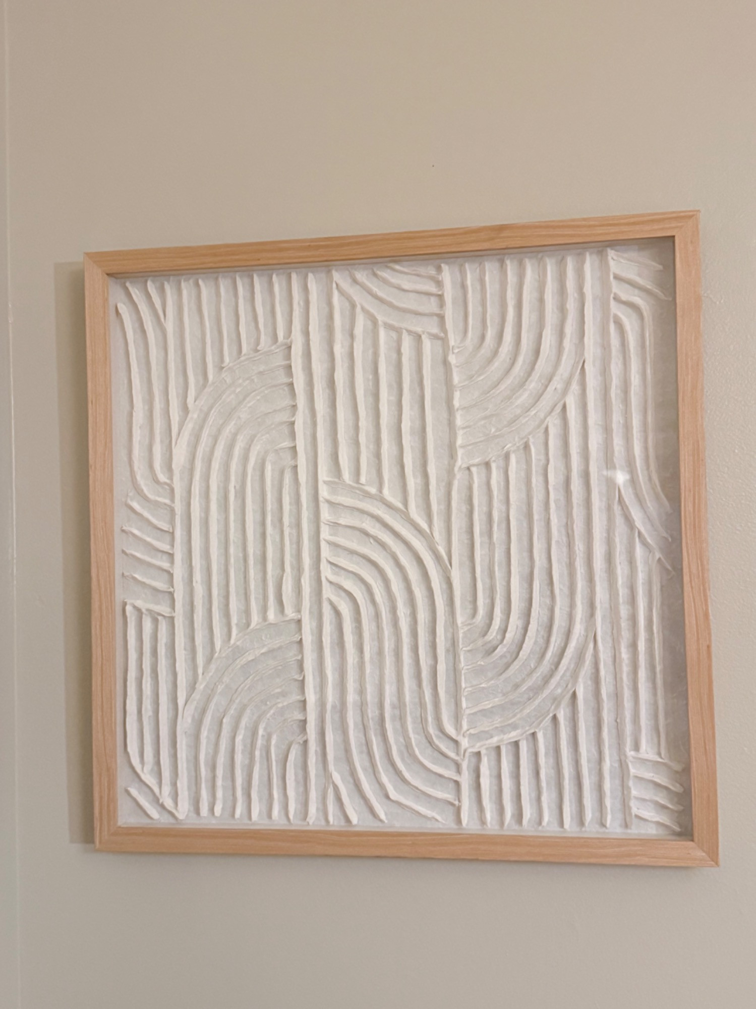 Textured White Wall Art in Wood Frame – 3D Modern Abstract Design This striking piece of modern wall art features a highly tactile, textured surface in white with an abstract raised-line pattern. The organic curves and vertical lines create a calming, contemporary aesthetic ideal for minimalist or modern interiors. Set in a light natural wood frame, the neutral palette adds warmth while allowing the texture to shine. Materials: Textured white sculpted material on board, natural wood frame Style: Modern, minimalist, abstract Back side includes wire for easy hanging