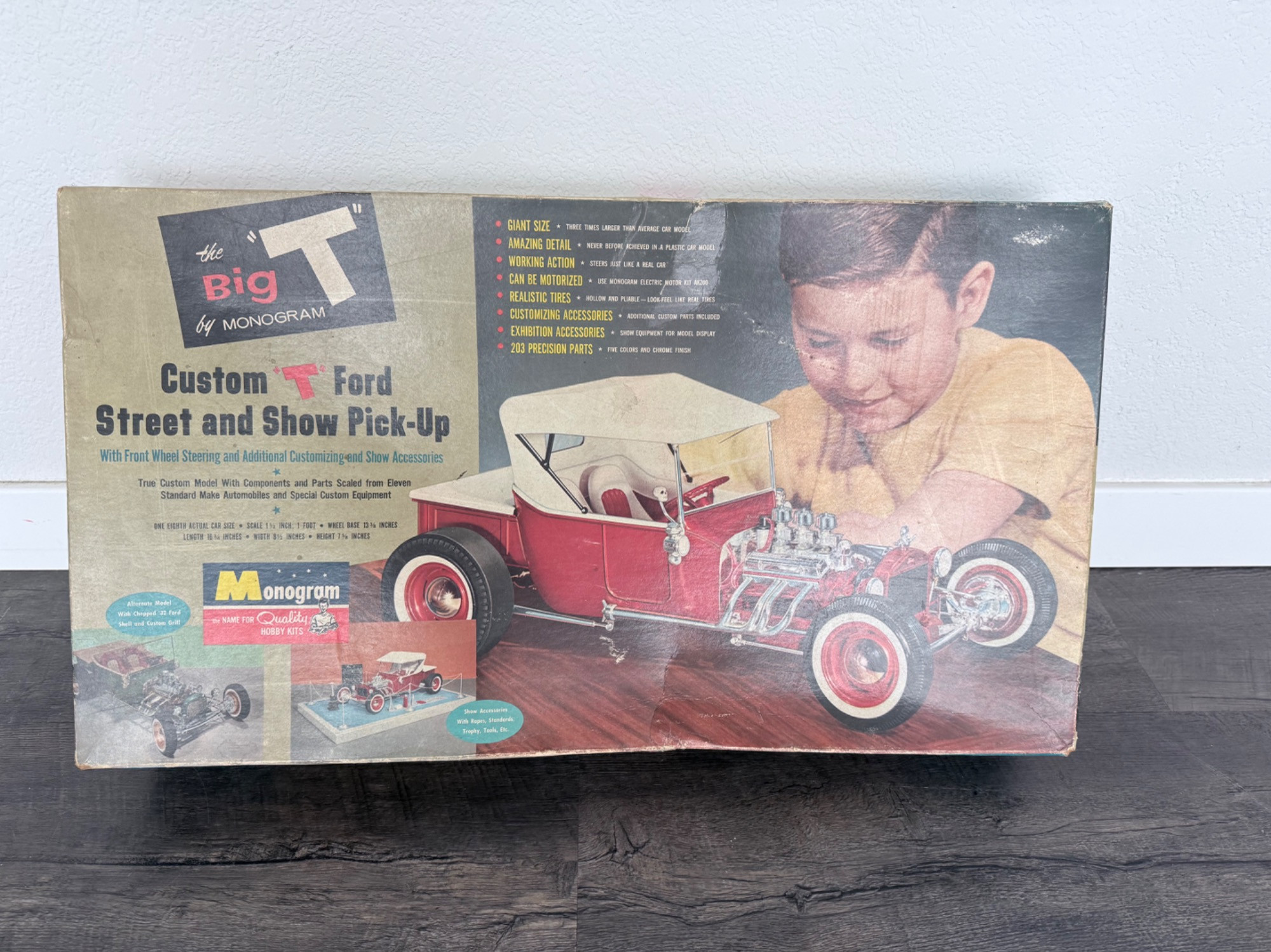 Monogram "The Big T" Custom T Ford Street and Show Pick-Up Model Kit (1962) A vintage and collectible Monogram model kit featuring the "Big T" Custom Ford Street and Show Pick-Up. This 1962 hobby kit is a large-scale (1½ inch = 1 foot) plastic model of a classic Ford T pickup, known for its impressive detail and nostalgic charm. Features include: 203 precision parts Front wheel steering Working action and realistic tires Optional motorization Customizing and exhibition accessories Detailed instruction booklet Dimensions of finished model: 16¾" long, 8½" wide, 7½" high Box dimensions: 26" x 14" x 5"