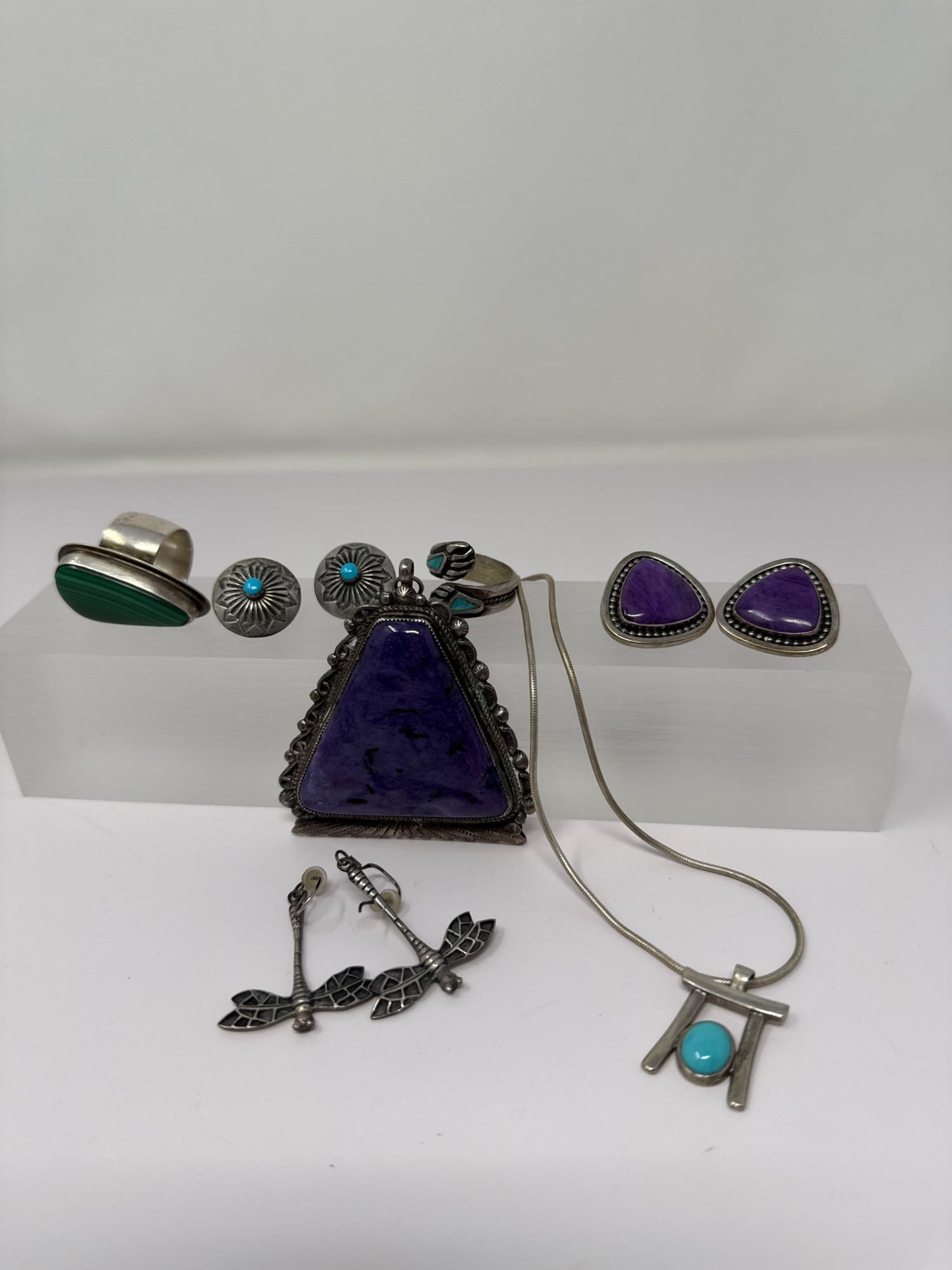 Sterling Silver & Gemstone Jewelry Collection – 87g Total Weight A beautiful and eclectic collection of sterling silver jewelry featuring bold stones and fine craftsmanship. Total weight: 87 grams. Includes: Large Sterling Pendant with Purple Stone Sterling Ring with Malachite Inlay Sterling & Turquoise Concho Earrings Sterling Dragonfly Earrings Sterling Necklace with Turquoise Pendant Sterling Ring with Turquoise & Purple Stone Sterling Purple Stone Earrings