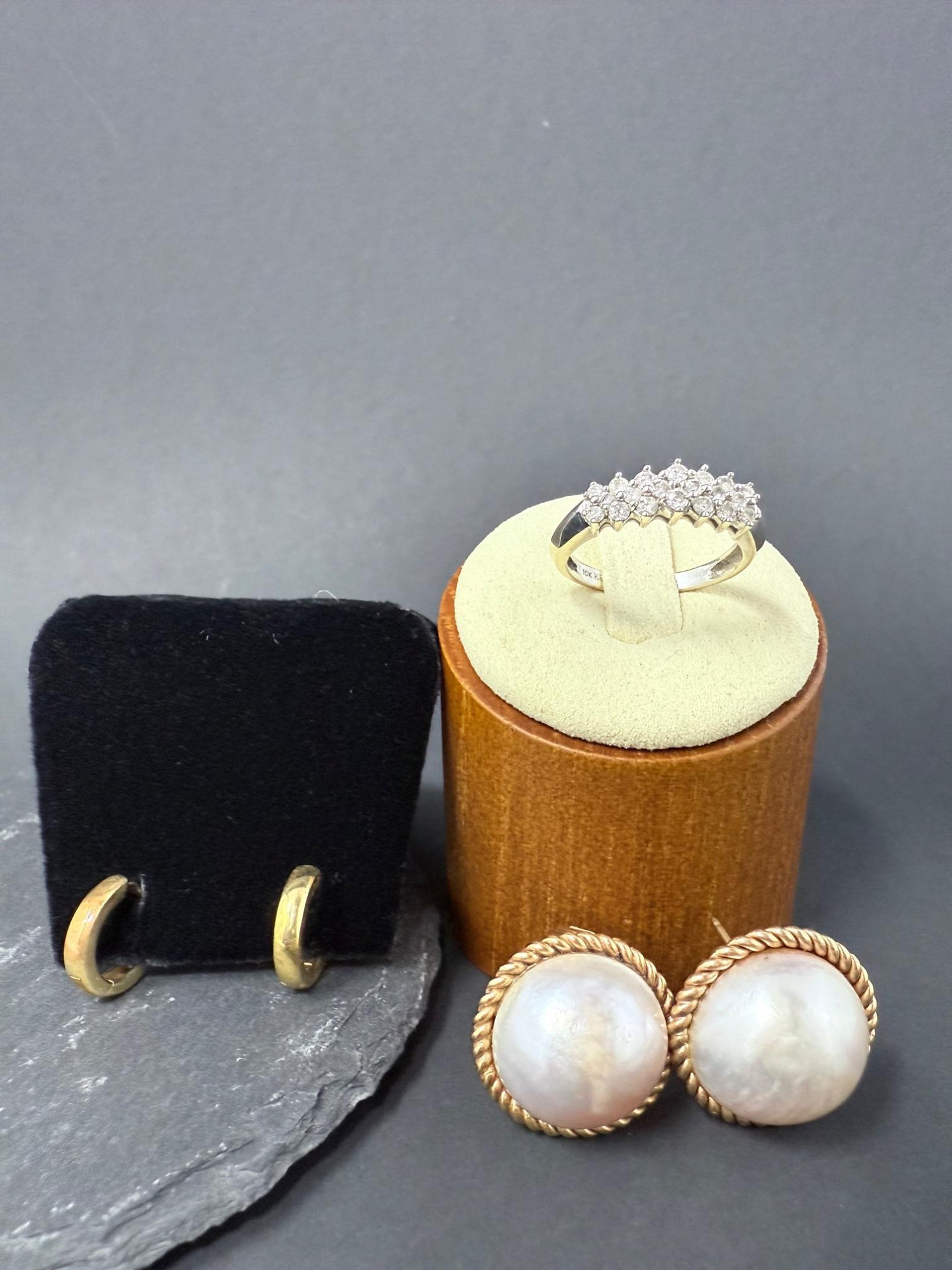 Fine Gold Jewelry Lot – Diamond Ring (10K), Pearl Earrings (14K), and 14K Gold Hoops – 3 Pieces This elegant 3-piece jewelry set includes a sparkling 10K white gold diamond ring, a classic pair of 14K yellow gold and mabe pearl earrings, and a minimalist set of 14K gold hoop earrings. Each piece is crafted from solid gold and showcases timeless style, making this an ideal lot for collectors, gift-givers, or anyone looking to add to their fine jewelry collection. 17 grams total weight. 🔹 10K White Gold Diamond Ring Set with 9 round diamonds in a cluster-style row Size: 7 Marked 10K all stones secure with great sparkle 🔹 14K Yellow Gold Mabe Pearl Earrings Large, domed pearl center with twisted rope border Clip-on style backs Marked 14K Classic and bold design, great for formal wear 🔹 14K Yellow Gold Hoop Earrings Small, round hoops with latch-back closures Perfect for everyday wear Marked 14K Light surface wearIncluded in the Lot: