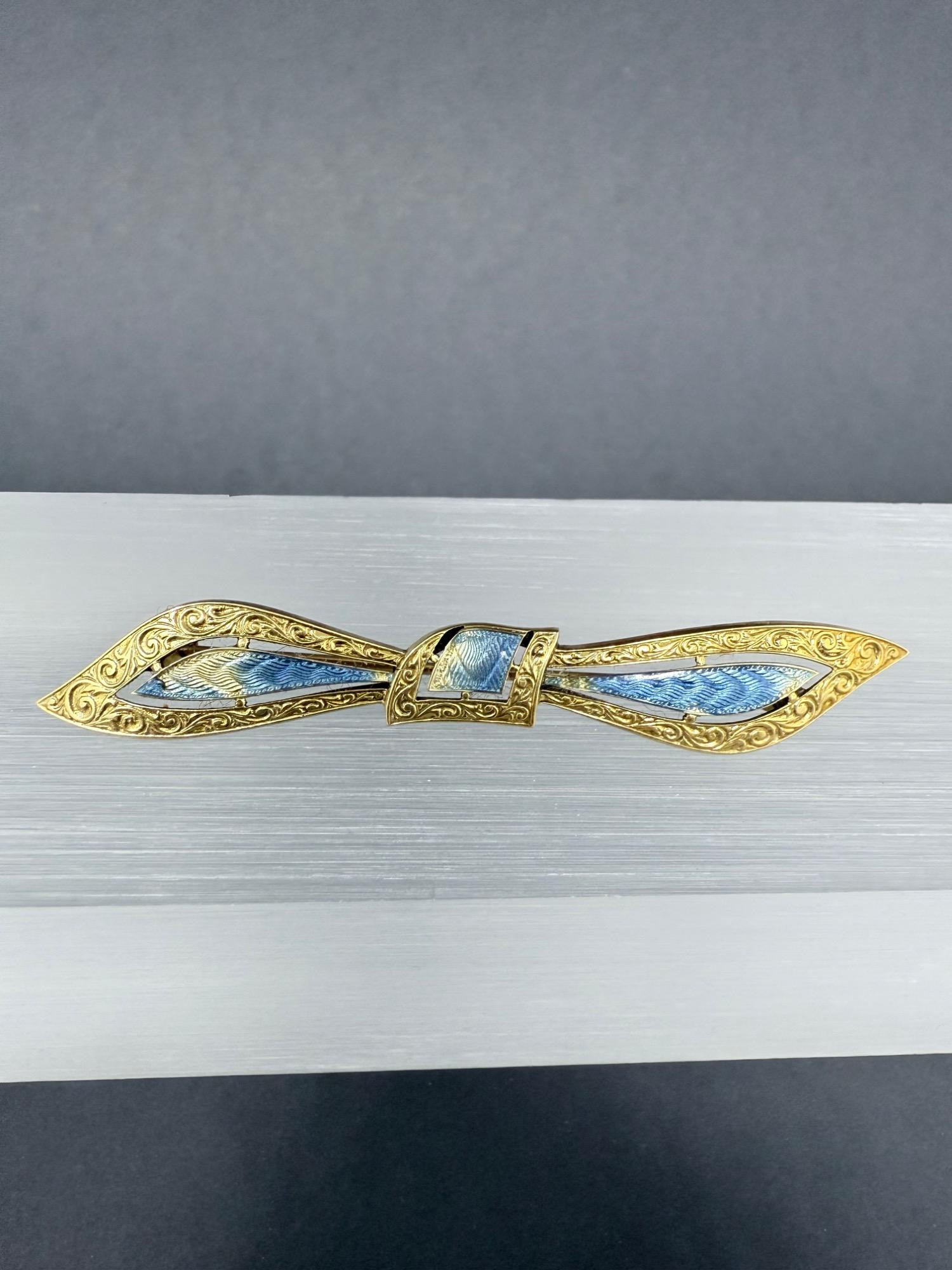 Lot # 16 - Antique 14K Gold & Blue Guilloché Enamel Bow Pin – 2.5” – Hand-Etched