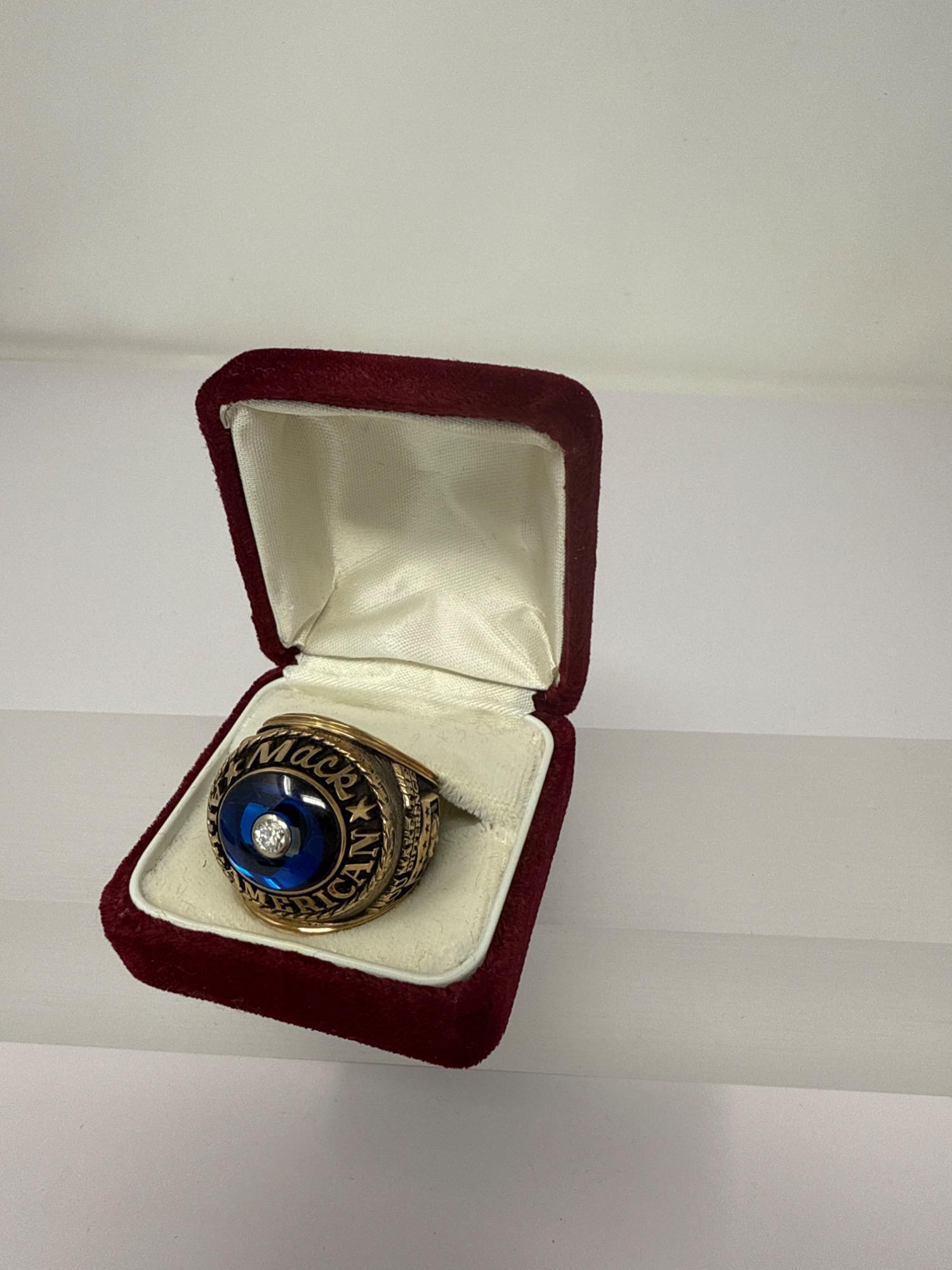 Vintage 1972 All-American Mack Truck Employee's Ring – 10K Gold, Diamond Accent – Size 11 – 34g This bold and iconic 1972 All-American Mack Truck Employee's ring is crafted in 10K gold and features a striking blue faceted stone set with a sparkling center diamond accent. A true piece of sports memorabilia, this heavy statement ring is rich with detail and history. Details: Year: 1972 Design: All-American Ring for Mack Trucks Employee “McCann” and “Mack” engraved Material: Solid 10K gold (marked inside band) Stone: Blue faceted center with inset diamond Ring Size: 11 Weight: 34 grams Condition: Excellent vintage condition with crisp detailing and minimal wear