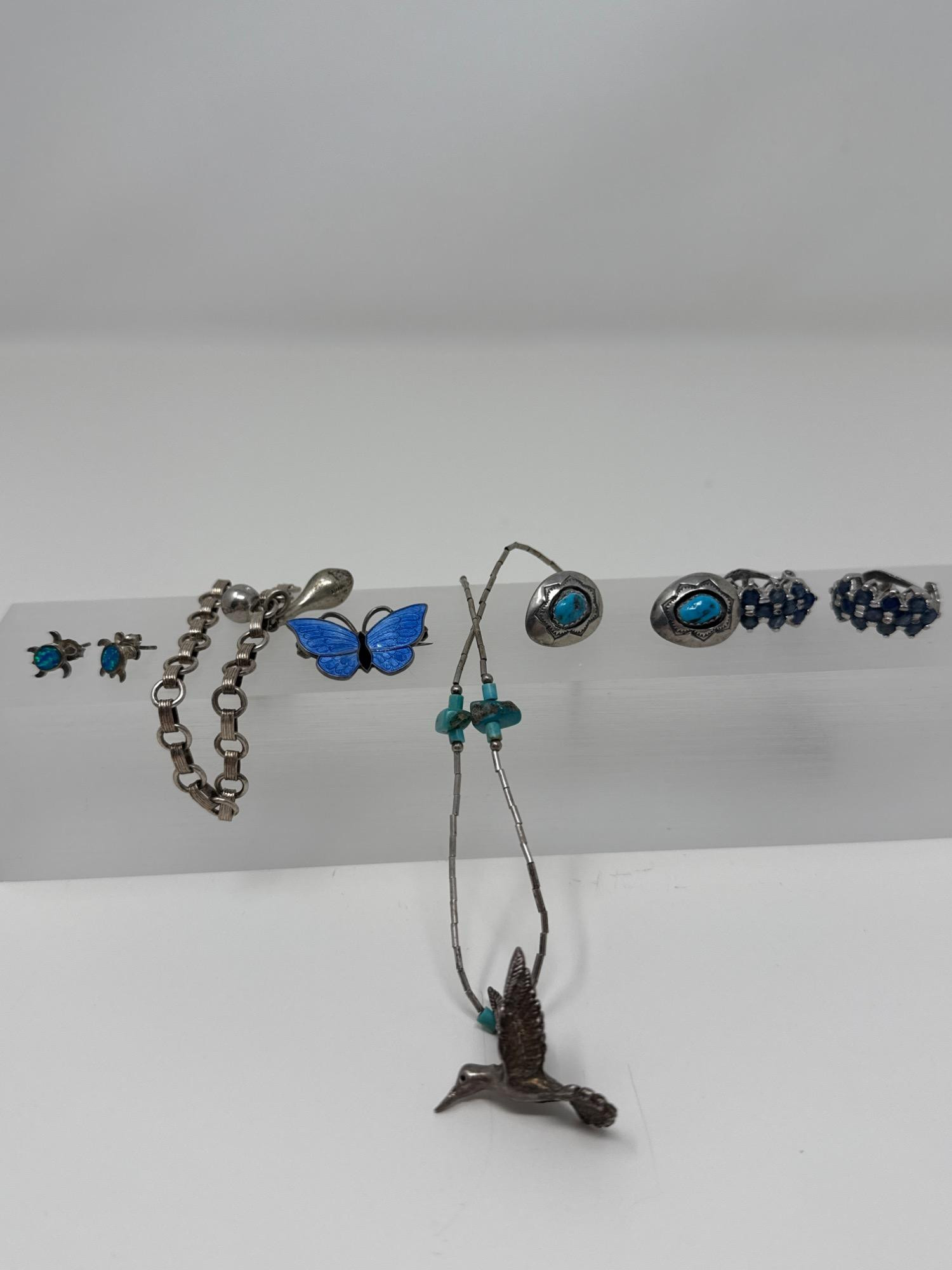 Lot of Mixed Vintage Jewelry – Mostly Sterling Silver A charming mixed lot of mostly sterling silver vintage and artisan jewelry. This collection includes a variety of unique and collectible pieces, perfect for resale, gifting, or adding to your personal collection. Included Items: Two sterling silver bracelets, one with a 3D flying bird pendant and turquoise accents, the other with a small charm Chunky sterling bracelet with teardrop and ball charm Pair of blue rhinestone or sapphire-toned clip-on earrings, marked 925 Enamel butterfly brooch in vivid blue. Artist likely: Aksel Holmsen collectible. Adorable sterling turtle stud earrings with opal or opalescent stones Highlights: Most items marked sterling Unique variety – nature, travel, and vintage themes Condition: some natural patina