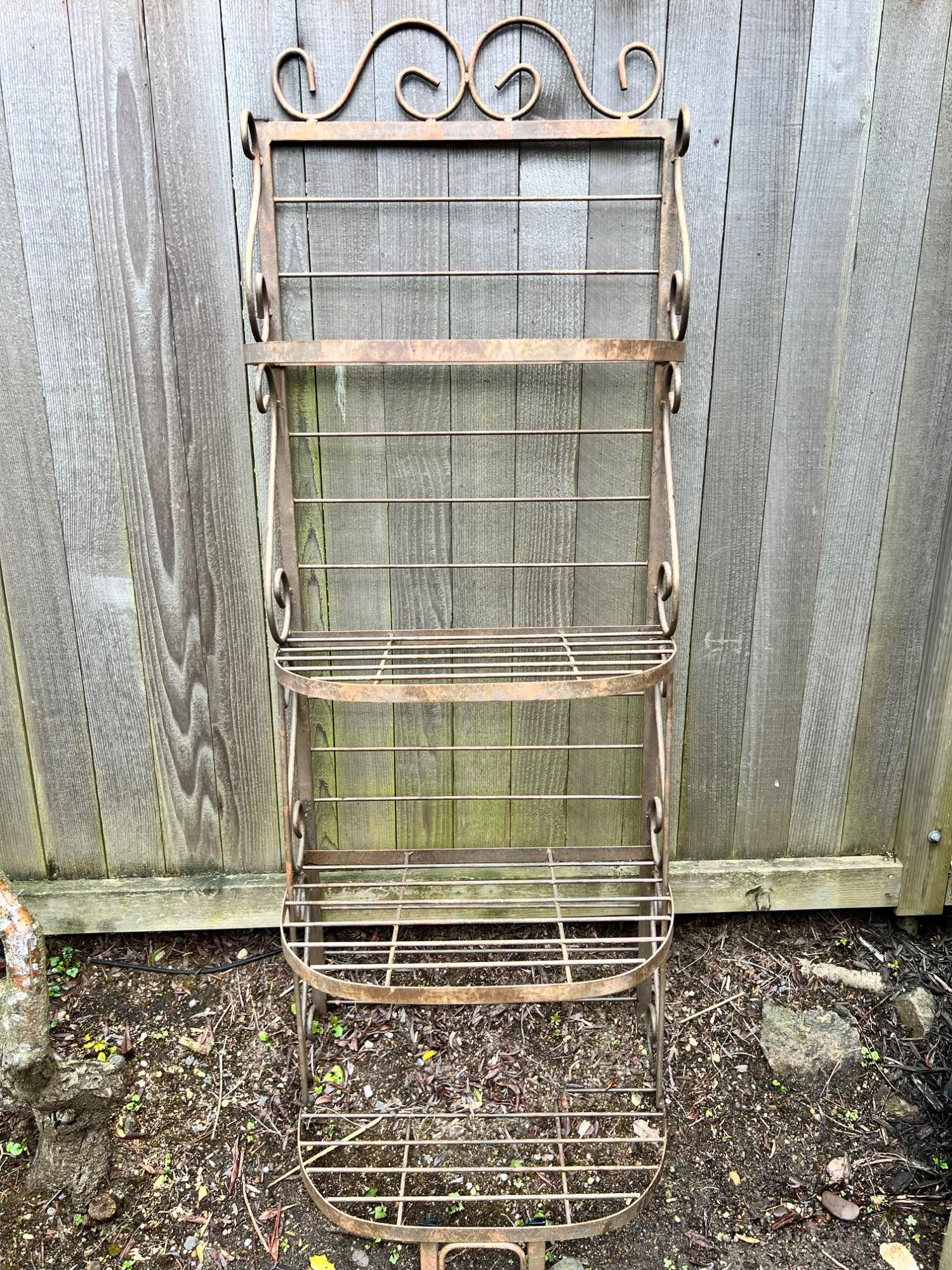 Vintage-Style Outdoor Metal Plant Stand / Tiered Shelf – 24” W x 16” D x 69” H This elegant 4-tier outdoor metal shelf is perfect for showcasing potted plants, garden tools, or decorative accents. Made of sturdy metal with a rust-toned patina, it features scrollwork detailing on the top and sides, adding vintage charm to any patio, porch, or garden. Dimensions: Width: 24" Depth: 16" Height: 69" Features: Four graduated wire shelves for versatile display Decorative scroll design on top and sides Weathered finish with natural rust patina for a vintage farmhouse look Freestanding and lightweight enough for easy repositioning Condition: