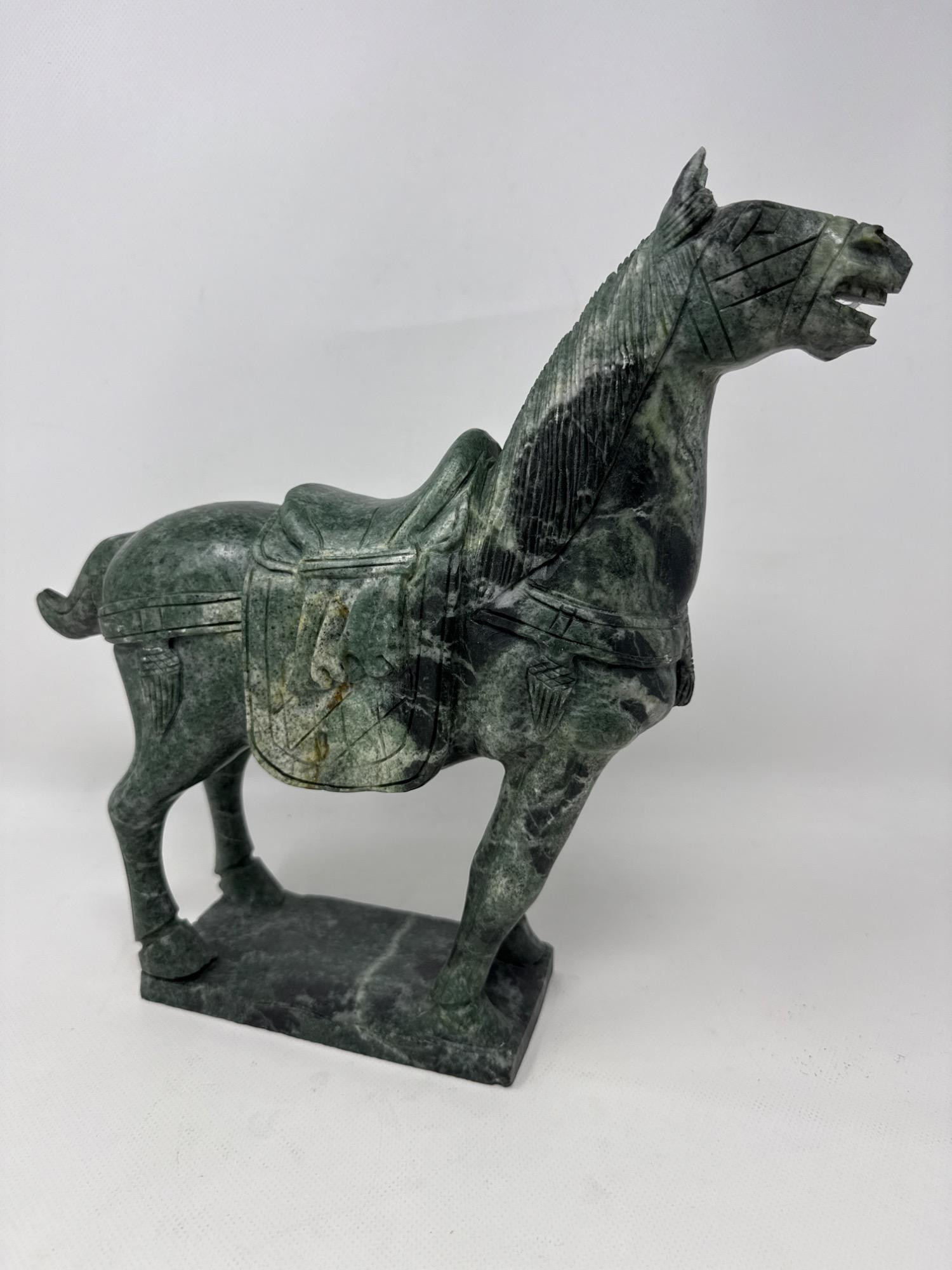 This elegant jade horse figurine is expertly hand-carved from natural green jade, featuring beautiful color variation and rich, detailed craftsmanship. The saddle is deeply etched, adding depth and authenticity to this collectible piece. Item Details: Material: Natural jade stone Dimensions: Approx. 13" tall x 3.5" wide Color: Deep green with light and dark veining Design Features: Finely carved saddle and harness details Defined mane and tail Mounted on a rectangular jade base Condition: Excellent with natural mineral veining, including a visible brown-orange inclusion on the saddle (see photo)