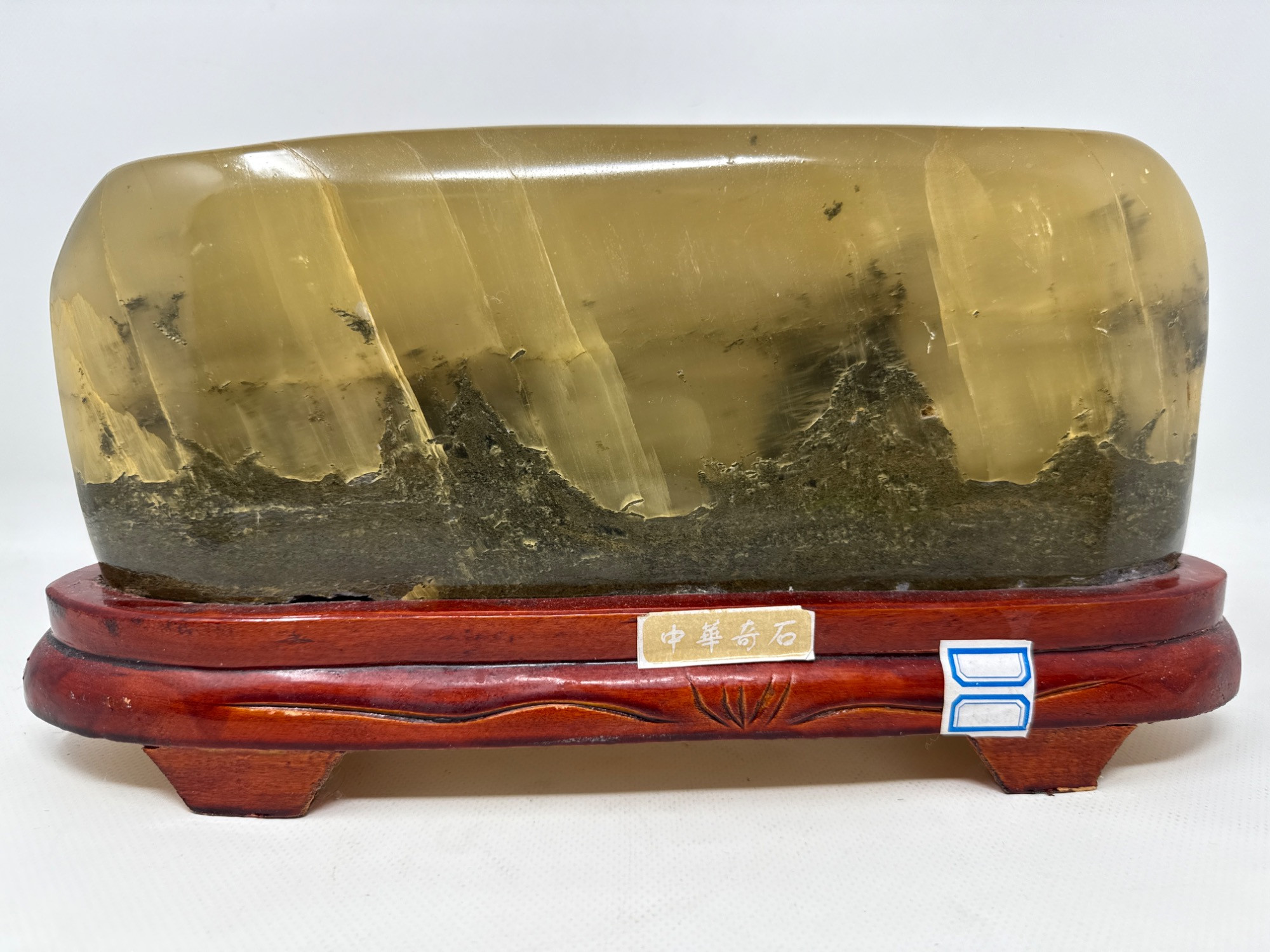 This stunning Chinese dendritic picture stone is a natural masterpiece, showcasing intricate branch-like patterns that resemble a serene landscape. Measuring 13.5” L x 7” H x 2.5” W, this remarkable specimen is polished to highlight its rich golden hues and striking dark dendritic formations. Resting on a beautifully crafted wooden stand. Material: Natural dendritic stone Origin: China Dimensions: 13.5” L × 7” H × 2.5” W Weight: 11.11pounds