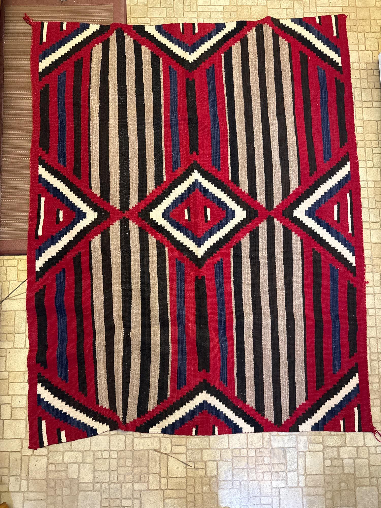 This vintage Indigenous rug features a bold geometric design in a rich color palette of red, black, white, gray, and deep blue. Woven with precision, the repeating diamond and stripe motifs reflect traditional Indigenous patterns, possibly Navajo or Southwestern in origin. Features: Authentic vintage Indigenous design Handwoven textile Dimensions: 58.5” L x 46” W Condition: Overall good vintage condition with minimal wear.