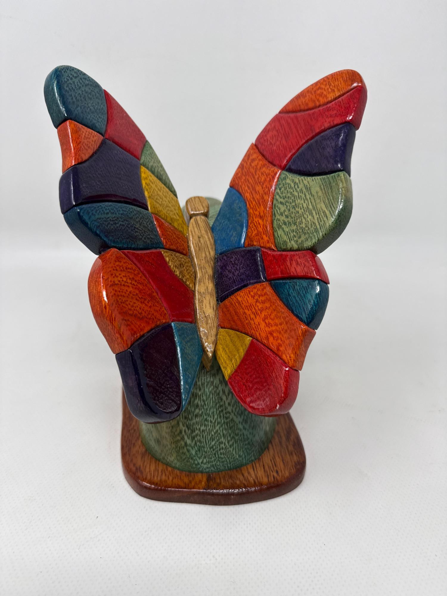 Bring a touch of vibrant Andean artistry into your home with this stunning handmade wood butterfly sculpture. Crafted with exquisite attention to detail, this piece features an intricate mosaic of hand-carved, hand-painted wood in rich, earthy tones and bold colors. Each segment of the butterfly's wings is uniquely shaped and dyed, creating a striking stained-glass effect that showcases the skill and creativity of traditional Andean craftsmanship. Material: Natural wood, hand-painted Finish: Hand-painted and polished One-of-a-Kind Piece: Due to its handmade nature, each butterfly is slightly different—making yours truly unique. Condition: Excellent pre-owned with no chips and cracks.