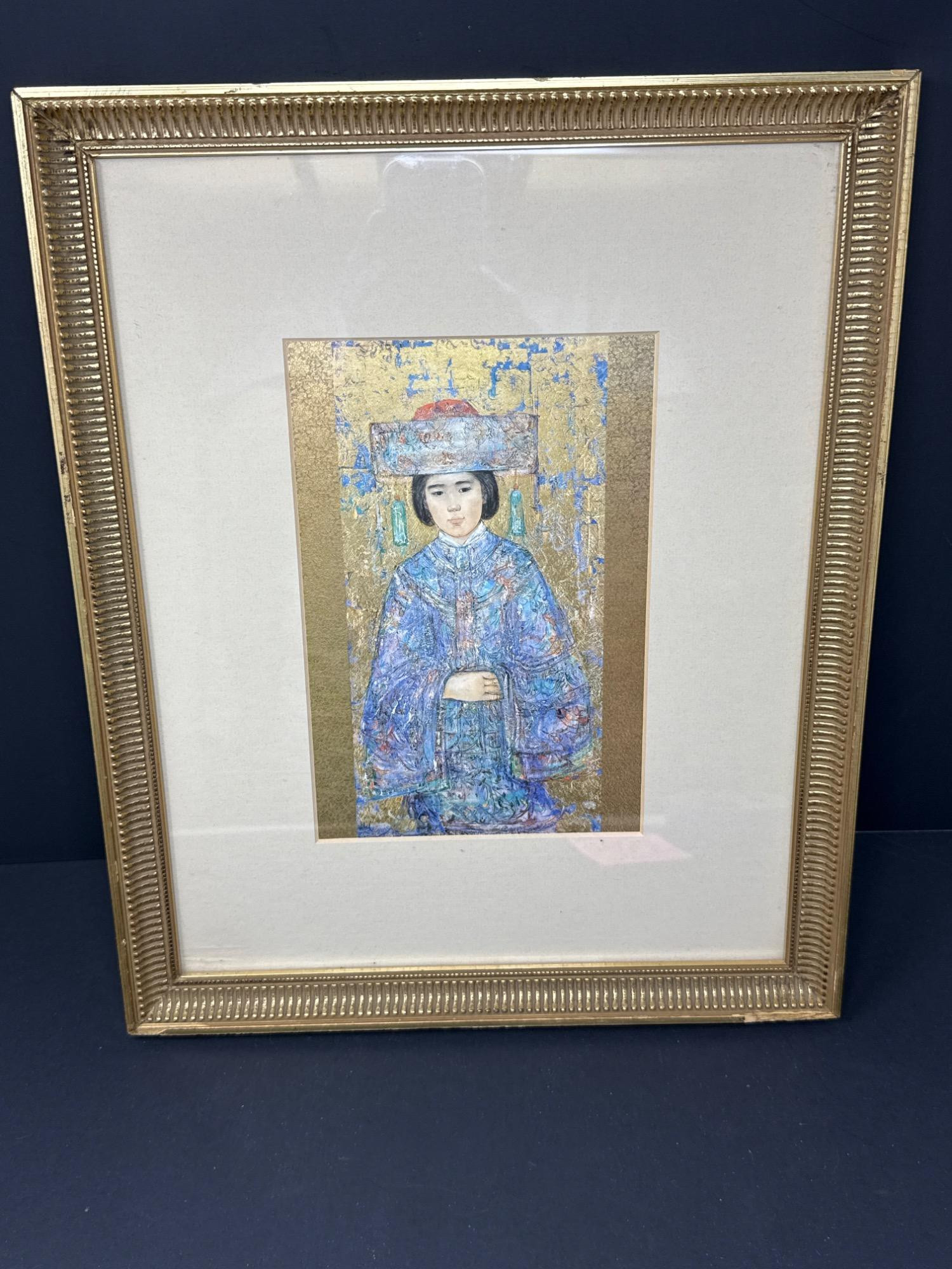 A beautiful and richly textured limited edition print titled "Chinese Bride" by renowned American artist Edna Hibel. This piece is number 515 out of a limited edition of 1000, printed in Switzerland in 1980 by Edna Hibel Corp. The image portrays a serene and elegant bride dressed in traditional Chinese attire, set against a shimmering gold background with Hibel's signature painterly style—soft, expressive, and layered with vibrant detail. The print is beautifully matted and framed in a classic gold frame with beaded detailing, ready to hang. Dimensions: 14" x 17" (framed) Condition: Excellent vintage condition with minor signs of age on the frame