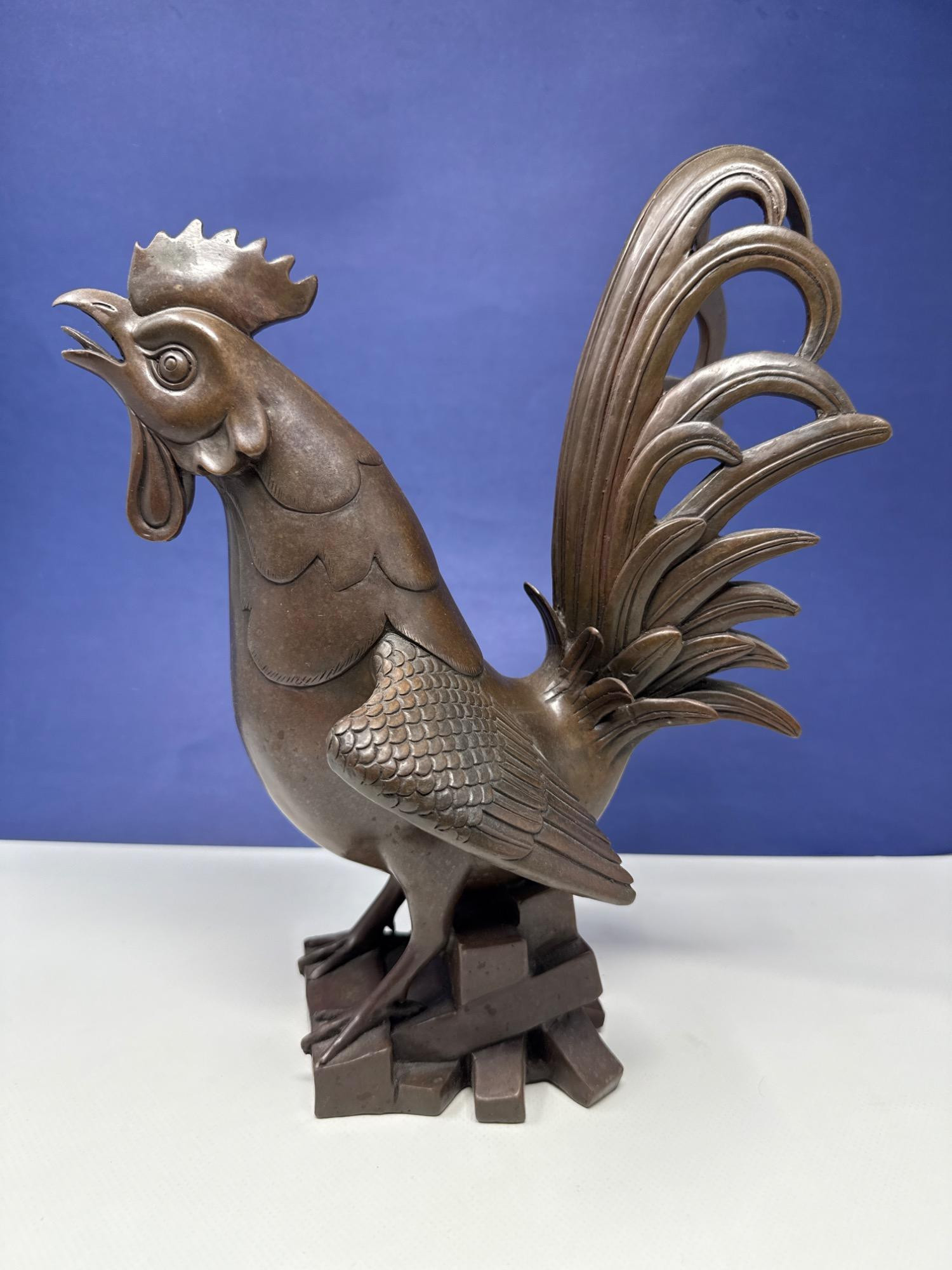 A bold statement piece, this beautifully crafted vintage Japanese bronze rooster sculpture features a solid, weighty presence and captures the proud, powerful stance of a rooster with intricate detailing. Expertly cast using traditional methods, the sculpture has a deep brown patina and a stylized base resembling stacked stones or wooden beams. A maker's mark is impressed beneath the figure, indicating origin from a skilled artisan—possibly dating to the Meiji or early Showa period. Features: Japanese origin Solid bronze with rich, aged patina Signed with character seal on the inner base Approximate dimensions: 12" tall x 9.5" long Felted base with center hole for stability or mounting
