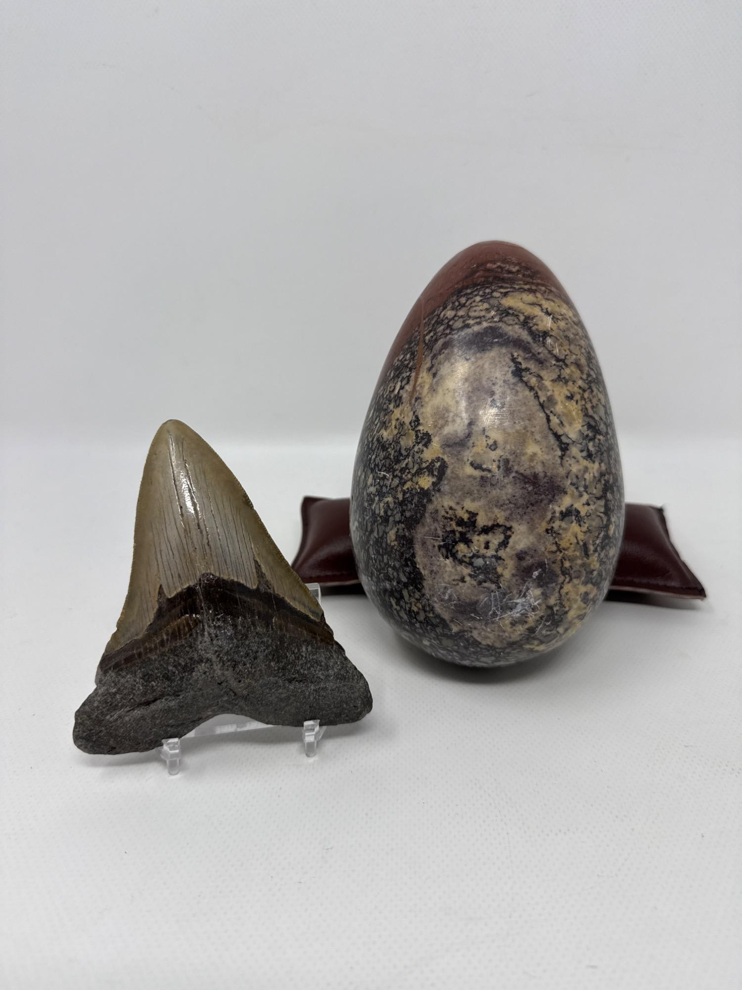 Lot # 45 - Ocean Jasper Egg & Megalodon Tooth Fossil Set