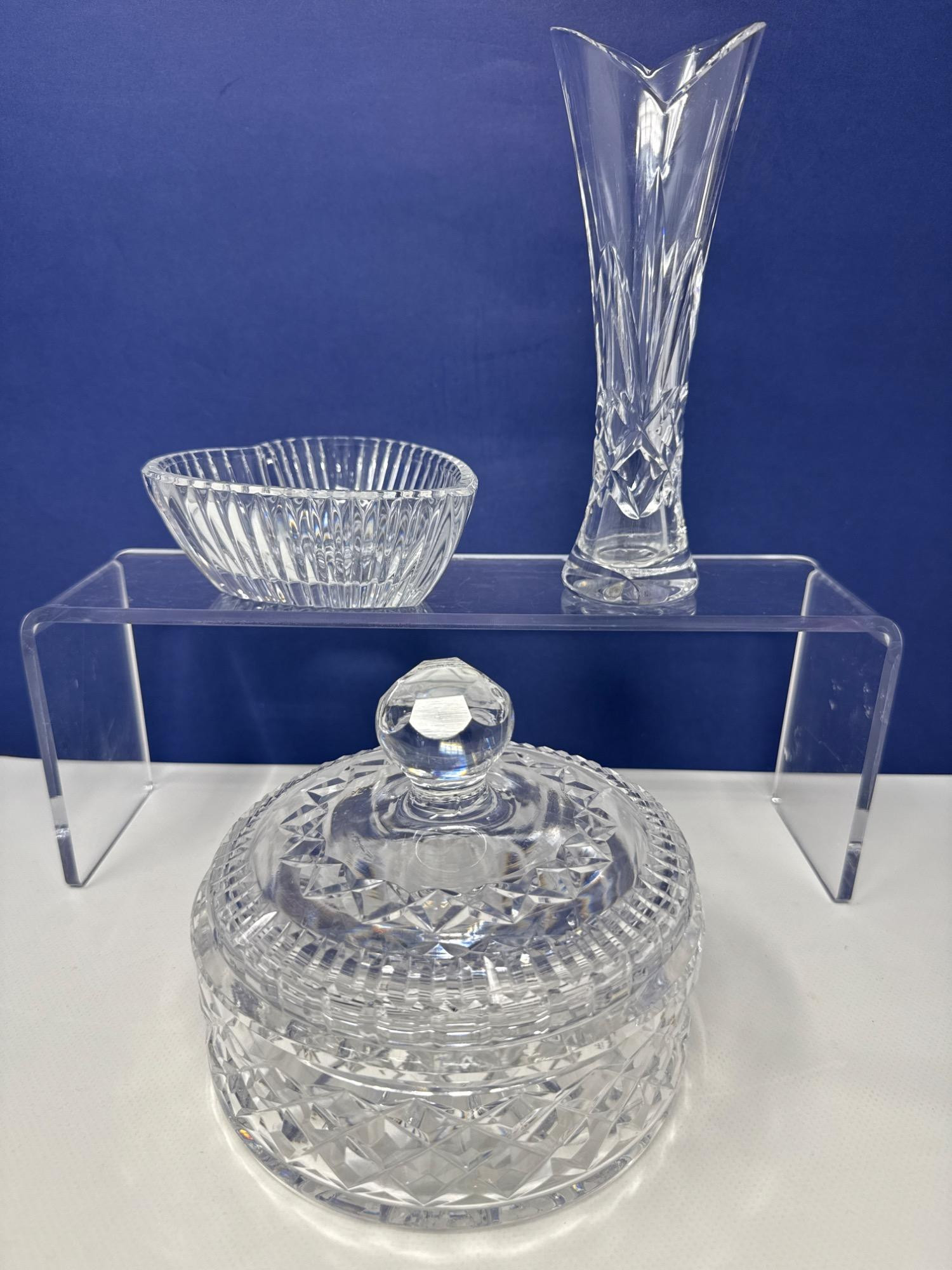 Lot # 46 - Waterford Crystal Trio – Vase, Lidded Dish & Heart-Shaped Bowl