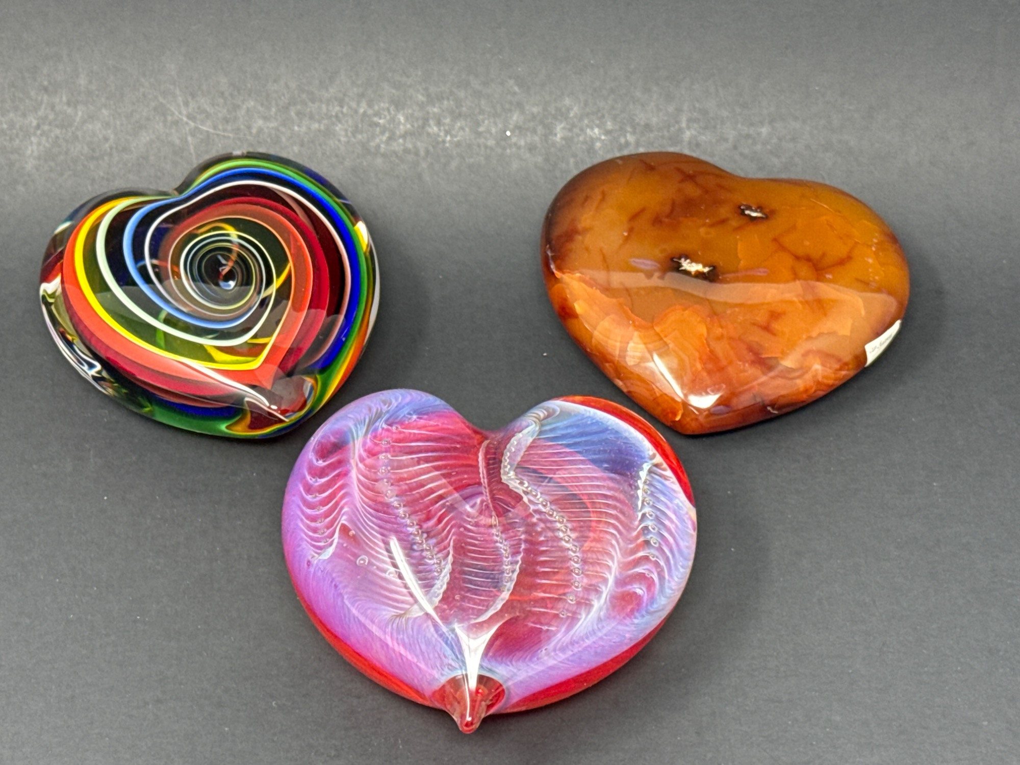 This vibrant trio of heart-shaped glass paperweights includes: Robert Burch Signed Glass Heart (2014) Carnelian Stone Lookalike Heart Rainbow Swirl Art Glass Heart Measurements: 3.5" x 3.5"