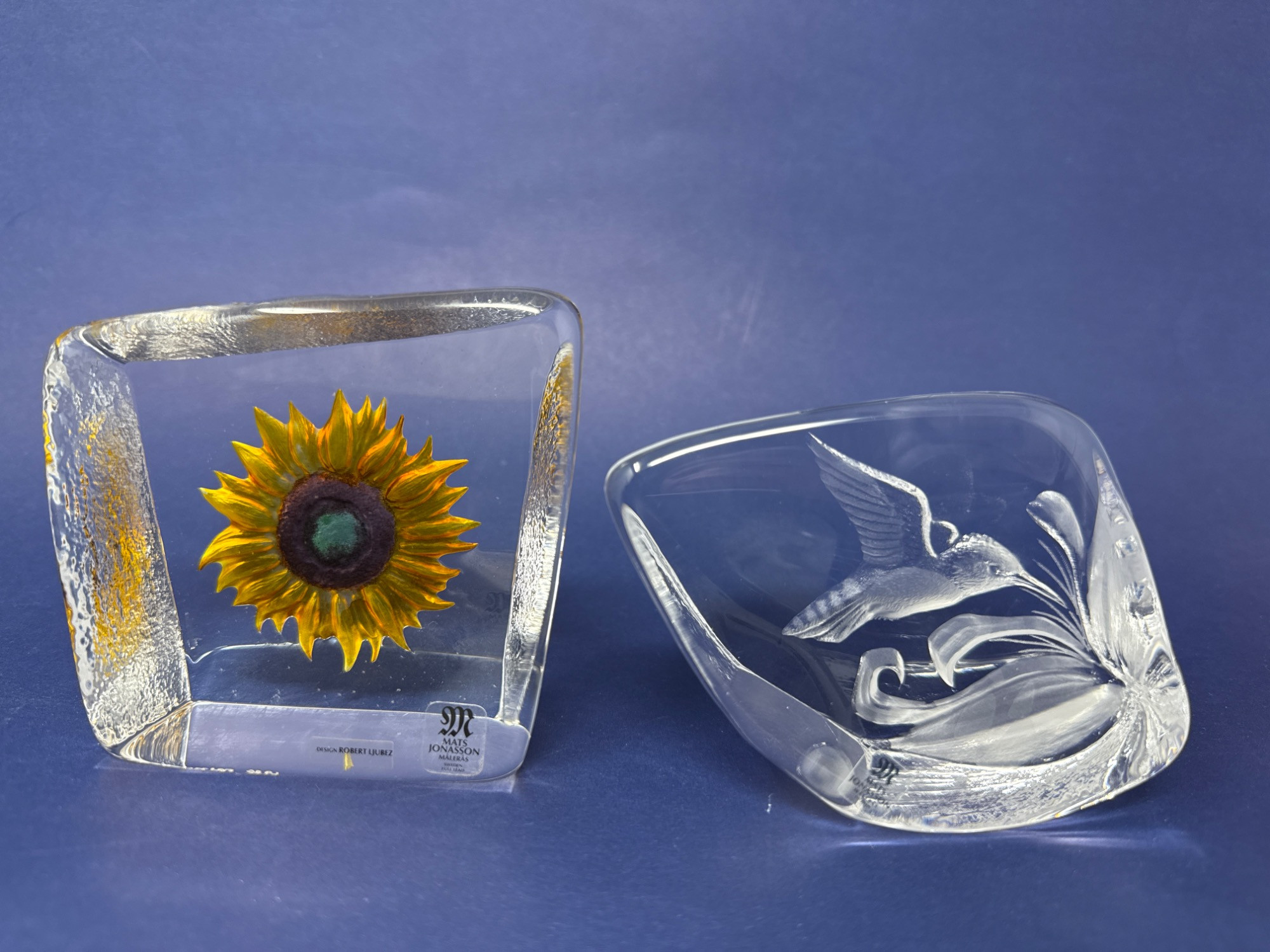 Scandinavian art glass set of two crystal paperweights by Mats Jonasson Målerås, made in Sweden. "Sunflower" Paperweight Design: Brightly colored sunflower in full bloom Artist: Robert Ljubez Item Number: 33869 Signed: “RL Målerås 3869” etched on base Sticker: Includes original Mats Jonasson and design label Box Included: Yes (Sunflower edition box) "Hummingbird" Paperweight Design: Gracefully etched hummingbird feeding from a flower Item Number: 33641 Signed: “MJ Sweden 3641” etched on base Sticker: Includes original Mats Jonasson sticker Box Included: Yes (Hummingbird edition box) Details: Material: Lead crystal Country of Origin: Sweden Condition: Both pieces are in excellent condition with no chips, cracks, or damage. Original boxes show minor shelf wear.