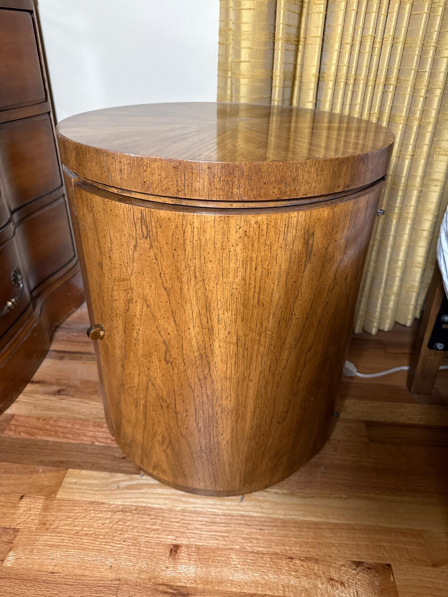 This beautifully crafted vintage round end table by Drexel Heritage showcases timeless mid-century style and quality craftsmanship. Made of rich walnut wood with a smooth, rounded silhouette, this piece features a hidden storage compartment accessed by a seamless door with a classic brass-tone knob. Brand: Drexel Heritage Furnishings Inc. Inspector Label: Forest E. Bradshaw, Plant 3 (Serial #61994) Wood: Walnut Dimensions: 18" diameter x 22" height Features: Round walnut top with gorgeous grain patterns Curved cabinet door with interior storage Brass-tone round knob Subtle mid-century modern design Condition: In excellent vintage condition with minimal wear consistent with age.
