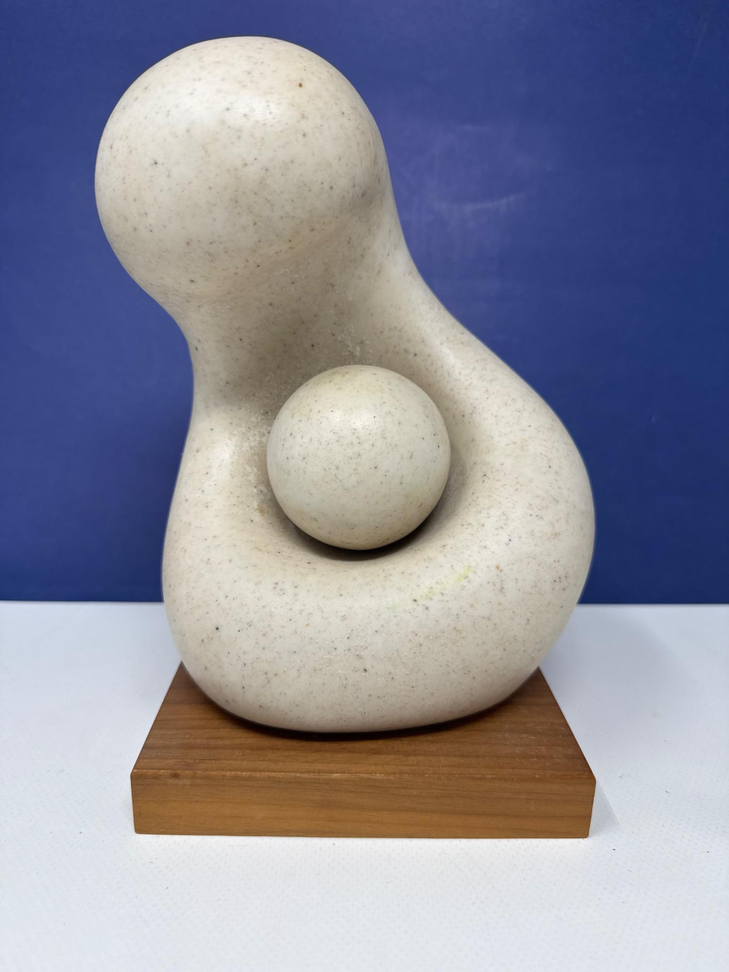 This is a striking mid-century modern sculpture titled "Mother and Child" by Walter Hanula, dated 1963. The abstract form captures the intimate bond between mother and child through two smooth, rounded shapes—one large and one smaller—gracefully intertwined in a minimalist embrace. The sculpture is made of a speckled off-white material and is mounted on a warm wooden base. Signed and dated on the reverse, the piece also features an impressed "63 AMR" mark, indicating the year and reproduction origin. A label affixed to the base reads: Dimensions: 9” H x 5.5” W Condition: Very good vintage condition. Surface shows light wear consistent with age.