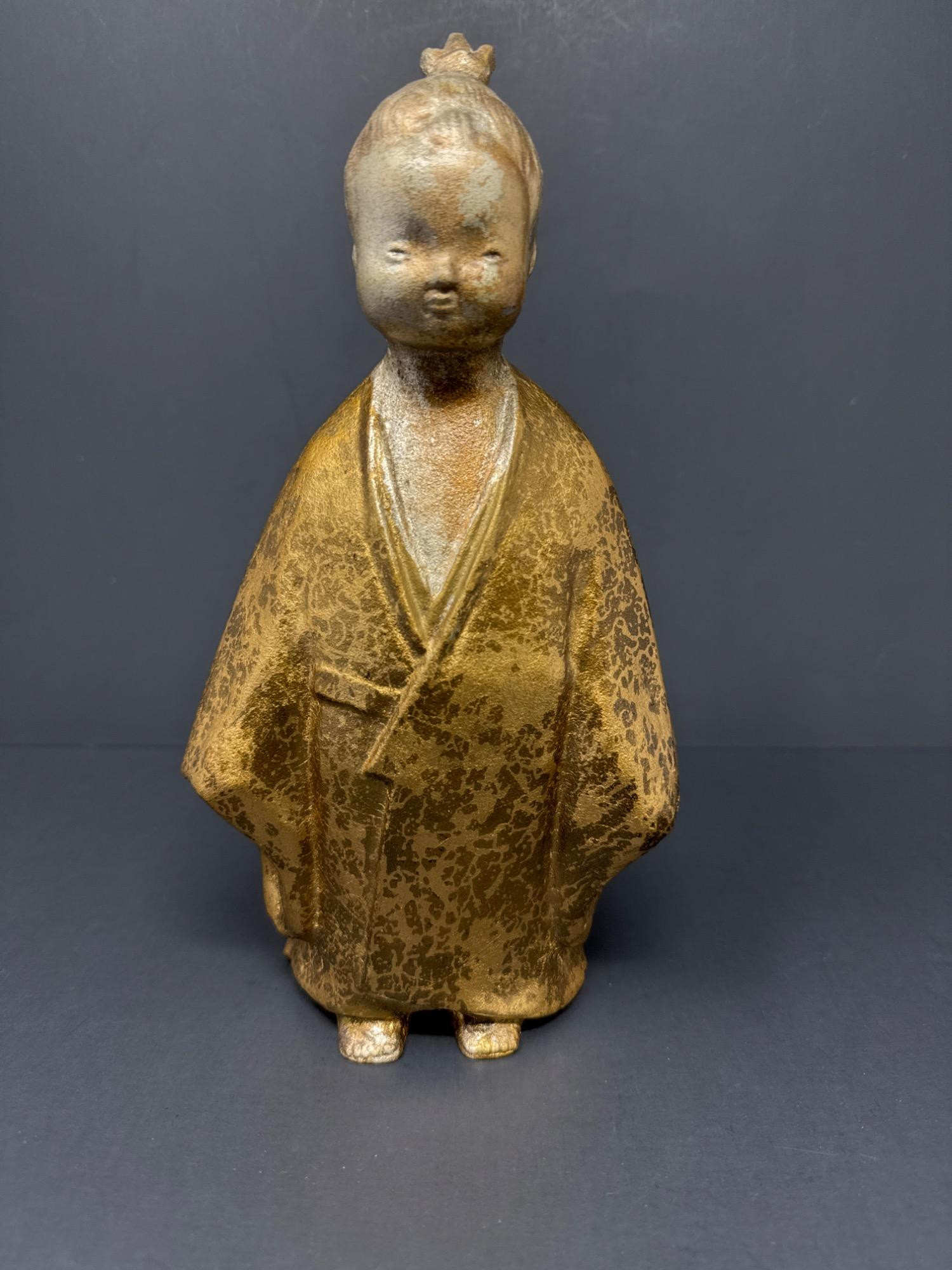 This unique vintage statue, titled “Selflessness Child,” is attributed to Okimo and dates back to the 1960s. Crafted from metal, the piece features a serene child dressed in traditional Japanese attire, finished in a beautifully aged golden-bronze patina. Material: Metal Height: 10.25 inches Width: 5.2 inches Condition: Excellent vintage condition with minor wear consistent with age. Please refer to photos for detail.
