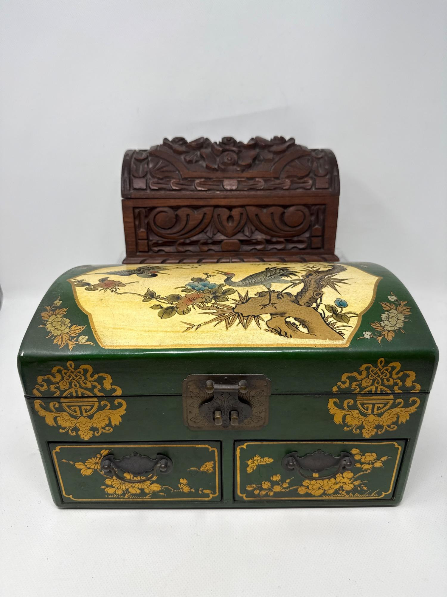 This beautiful lot includes two unique vintage jewelry boxes, each with its own distinct character and craftsmanship: Green Lacquered Box with Mirror and Drawers Features hand-painted floral and crane designs in gold and multicolor on a deep green lacquered surface Interior lined with printed Asian script and figures; includes a hinged mirror Two pull-out drawers with ornate metal handles Decorative metal clasp and side hardware Dimensions: Approx. 10"L x 6"T x 5.75"W Carved Wooden Box with Hinged Lid Hinged lid opens smoothly to a clean, spacious interior Skillful hand-carved design with raised floral centerpiece and curved edge detailing Unique fold-open construction with vintage metal hinges Dimensions (approx.): 12"L x 6.5"W x 7.5"T Condition: Both in excellent vintage condition with light signs of age.