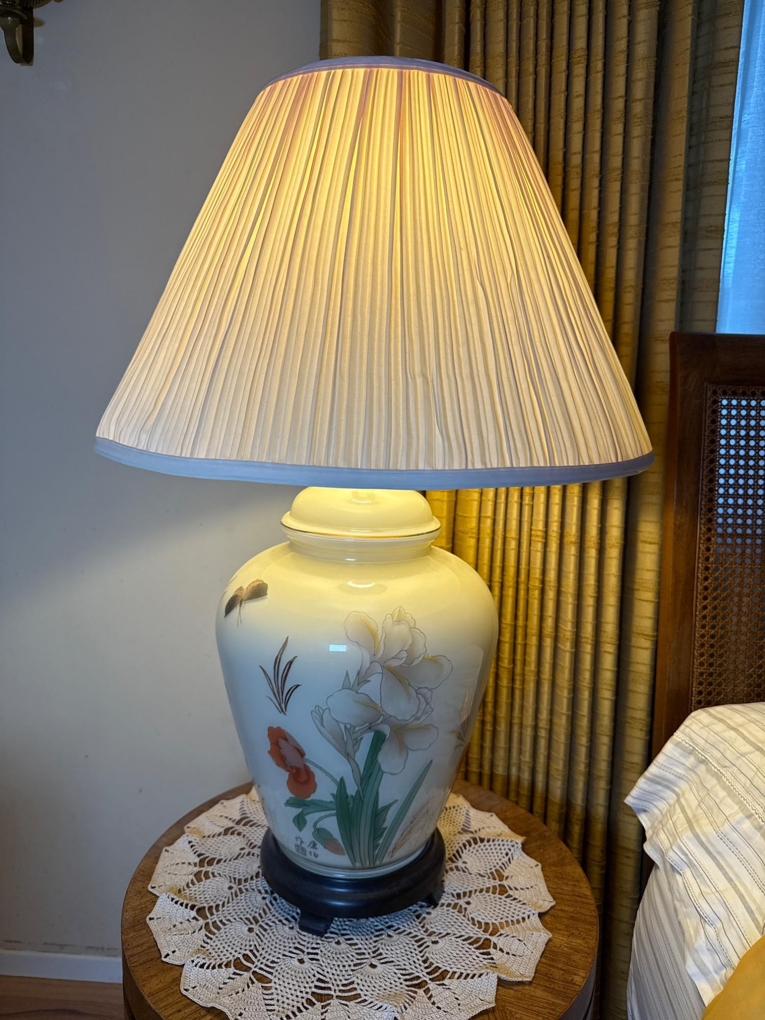 This elegant table lamp features a hand-painted porcelain base adorned with delicate white irises, red blossoms, flowing grasses, and a graceful butterfly. The artwork is richly detailed in soft, natural tones with light golden accents. Dimensions: 30” H x 19” W (with shade) x 10” Base Width Condition: Excellent vintage condition with minimal signs of wear. Lamp is tested and in working order.