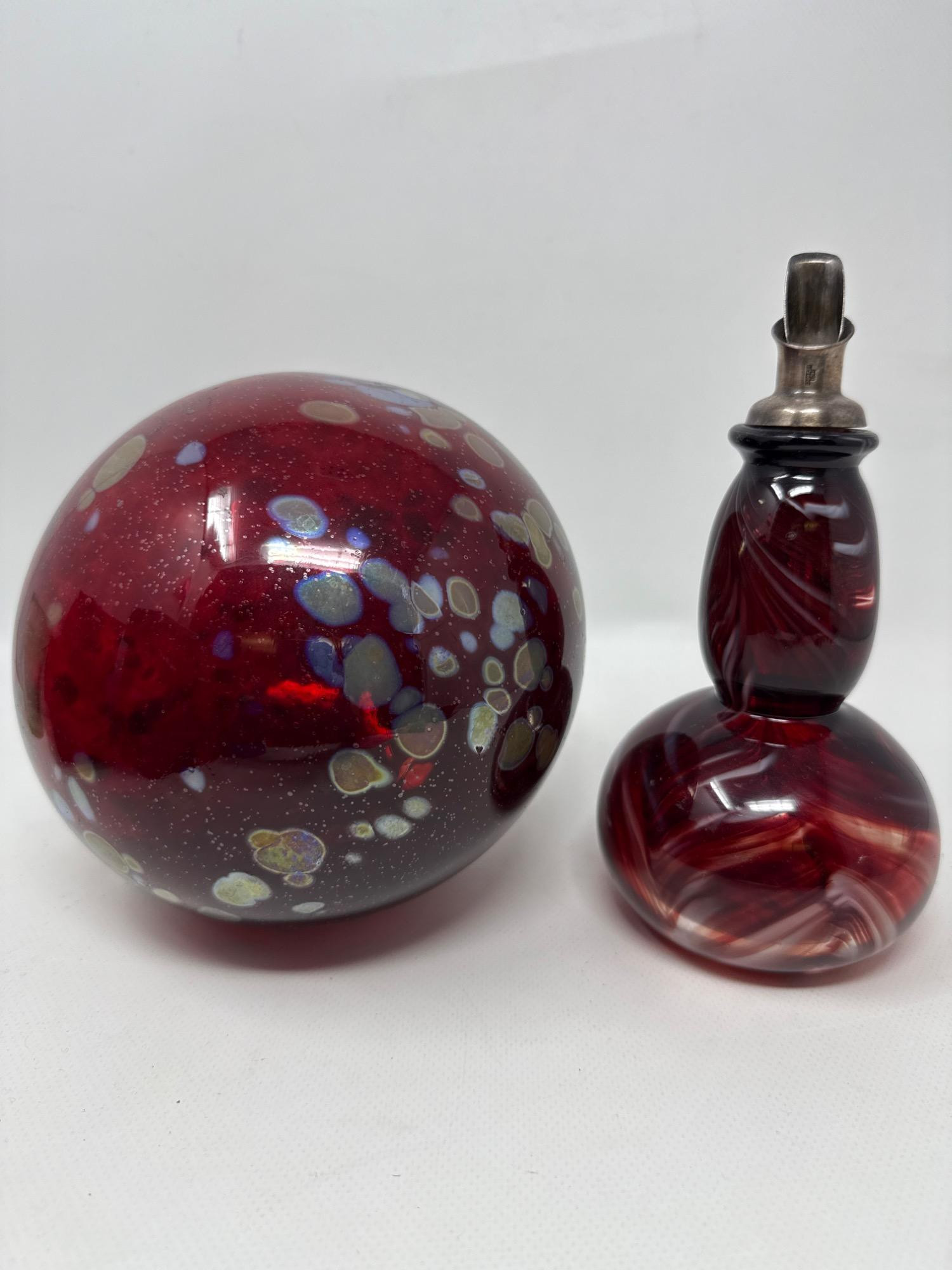 Add a vibrant splash of artisan elegance to your space with this striking handblown red glass float and decanter set. Crafted with rich crimson hues and swirling patterns, the pieces exhibit the hallmarks of expert craftsmanship. Red GlassFloat: Features a deep ruby body with ethereal bubbles and multicolor speckled inclusions, creating a galaxy-like effect. Measurements: Approx. 6.5" diameter Decanter: Gracefully swirled with red and white glass, topped with a removable cork and metal spout. Measurements: 8" H x 4" W Signature: Etched “Goose Bay Glass, Townsend, MT, 2007” on the bottom of the decanter – a collectible piece from a known Montana glass studio. Condition: Excellent pre-owned condition. No chips, cracks, or repairs. Minimal surface wear consistent with display use.