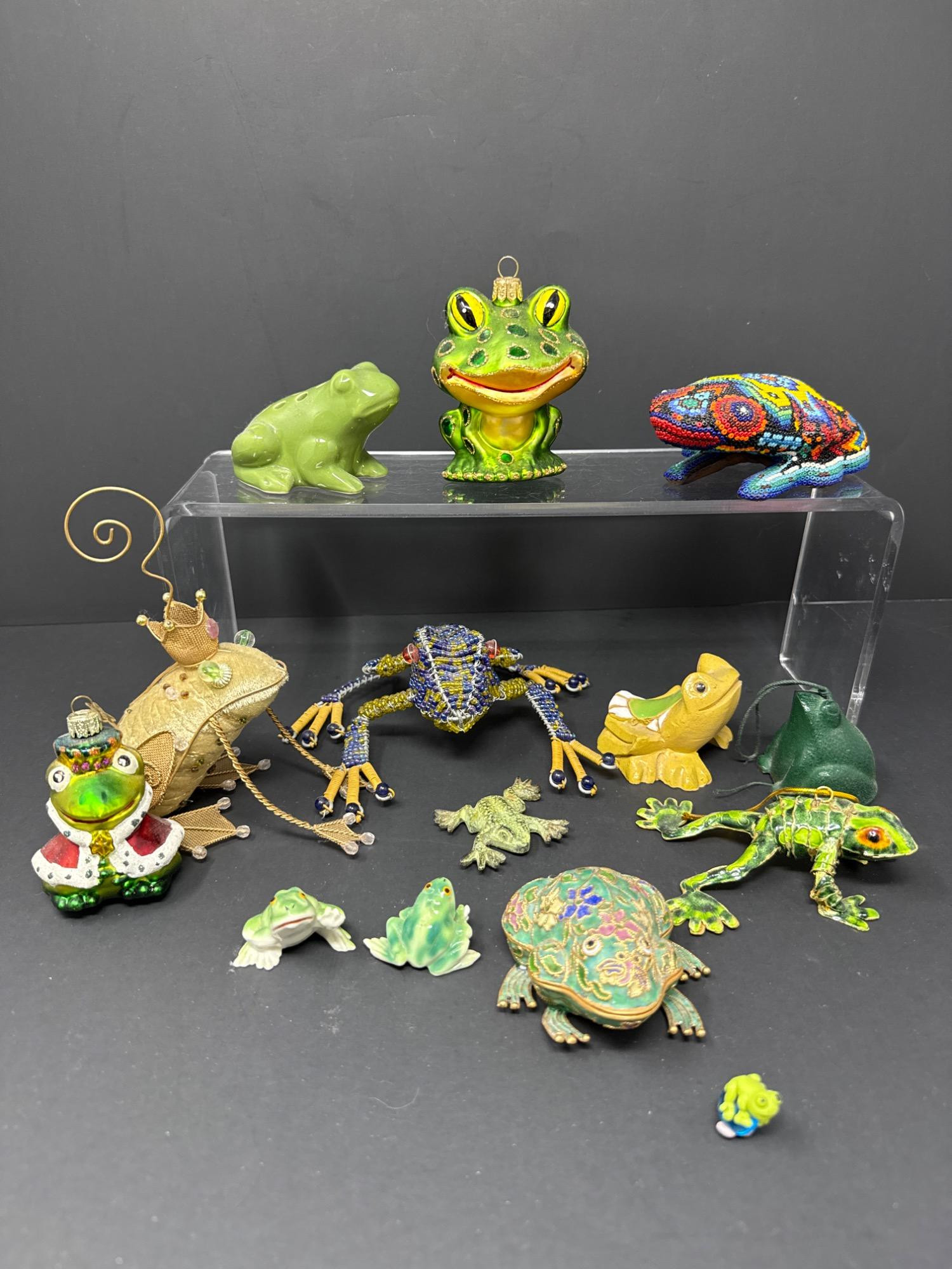 Hop into whimsy with this delightful collection of vintage frog figurines. This diverse lot features a variety of materials including painted ceramic, resin, metal, beaded artwork, and possibly pewter. Highlights include: Beaded Huichol-style frog with original “Hecho en México” label Polished silver-tone frog signed “Moore” with bright green eyes Adorable frog figurines in costume, including a jester and a king Hand-painted frogs, one with intricate gold detailing Assorted sizes and styles—whimsical, realistic, and artistic Condition: All pieces are in pre-owned condition with light wear appropriate to age. See photos for full details.
