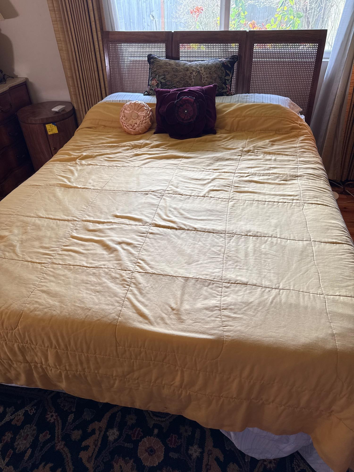 Beautifully crafted vintage walnut bed featuring a three-panel woven cane headboard. The solid wood frame highlights mid-century craftsmanship, while the cane accents add texture and style. This bed is paired with a Tempur-Pedic low-profile adjustable base (Model: LXP-QPWR2-ALAB), manufactured in 2014, and comes with the original wireless remote to adjust both the head and foot sections independently. The adjustable base functions smoothly and offers great ergonomic flexibility with memory presets and a flat reset option. Details: Size: Queen (60" x 80") Frame: Solid walnut with cane panels Base: Adjustable, model LXP-QPWR2-ALAB, Foundation ID TPXJ-01 Remote: Original Tempur-Pedic wireless remote Measurements: 58" W x 82" L x 44.5" H Condition: Frame and cane excellent, base fully functional, mattress has visible staining on one side. Memory foam mattress