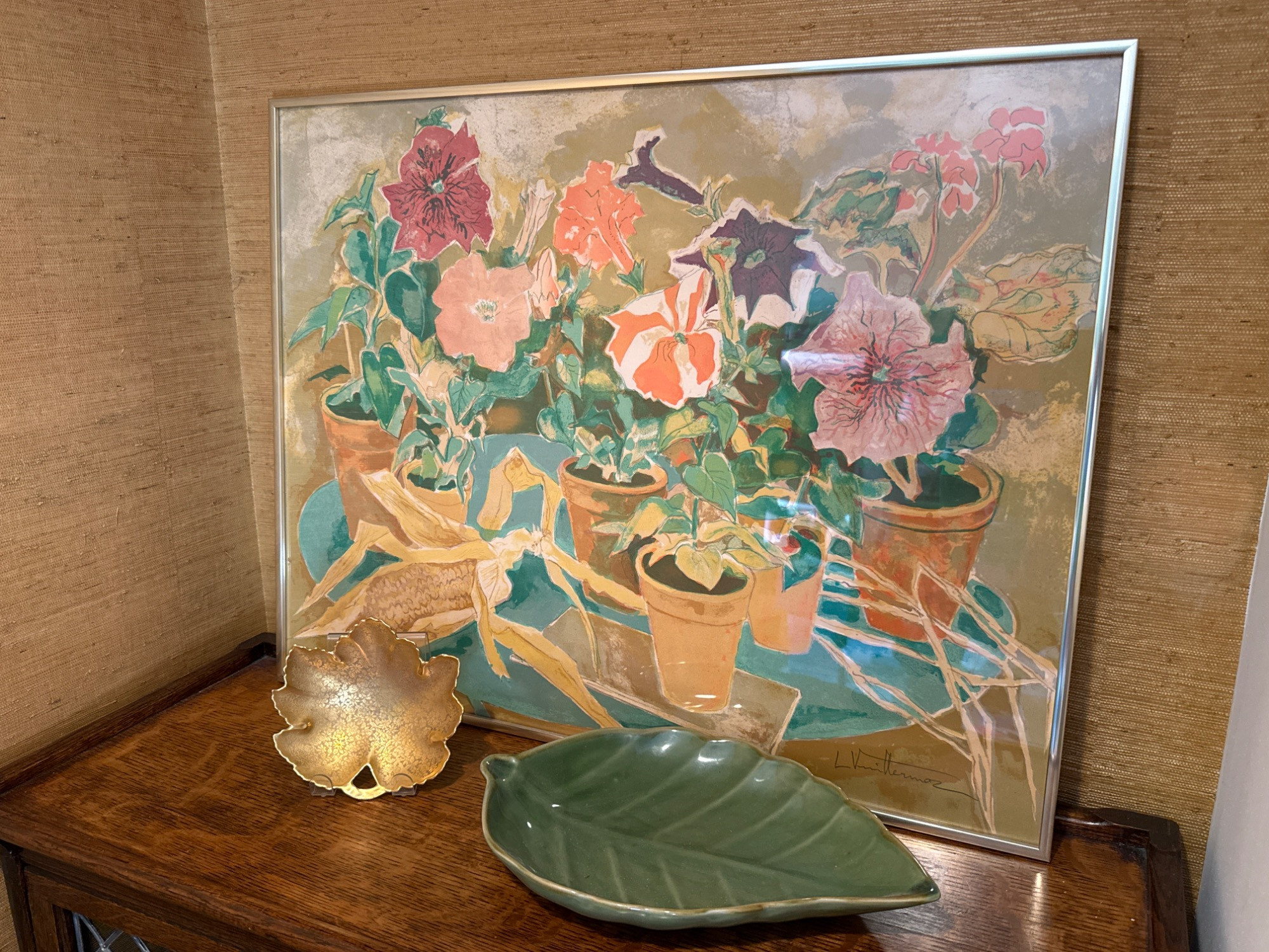 This elegant display features a beautifully detailed floral print by artist L. Vuillemot, numbered 169/260, and framed by Kulicke Frames Inc., a respected New York-based framing company. The artwork captures a vibrant and lush arrangement of potted flowers in warm earthy tones, bringing a sense of life and serenity to any space. Complementing the artwork are two unique decorative plates: A golden leaf-shaped plate with intricate floral etching and a signature on the back, showcasing fine craftsmanship and a subtle shimmer. A green ceramic leaf dish marked “214 West”, both dishwasher and microwave safe, made in China. Its natural leaf form and soft glaze make it a perfect accent for a rustic or botanical-themed decor.