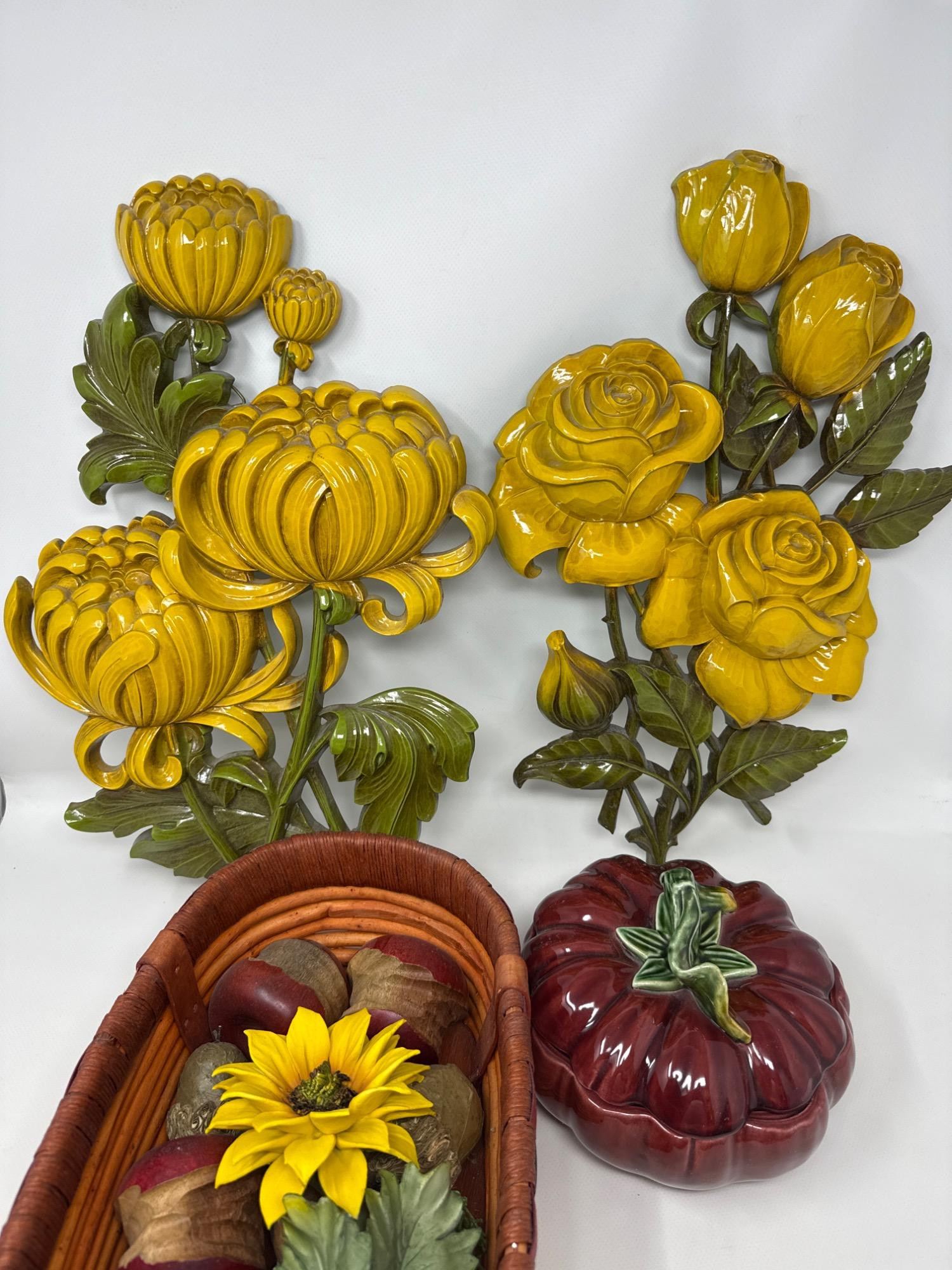 This curated lot features: Two Syroco USA floral wall hangings (marked A-4460), dated MCMLXII (1962), featuring vibrant yellow chrysanthemums and roses with rich green foliage. These iconic mid-century molded plastic wall plaques showcase the timeless Syroco style. One Italian Capodimonte ceramic sunflower with stem and leaf, marked Uno Alla Volta – Made in Italy, known for its detailed, hand-painted craftsmanship. One glazed ceramic pumpkin dish made in Portugal, marked A. Subtil B214, with a removable lid and a deep burgundy hue—ideal for autumn display or storage. Assorted artificial produce and florals, including carved apples, strawberries, mulberries, and ornamental elements housed in a woven vintage-style basket—perfect for farmhouse or harvest-themed displays. Dimensions: Wall plaques: 18” H x 11.5” W