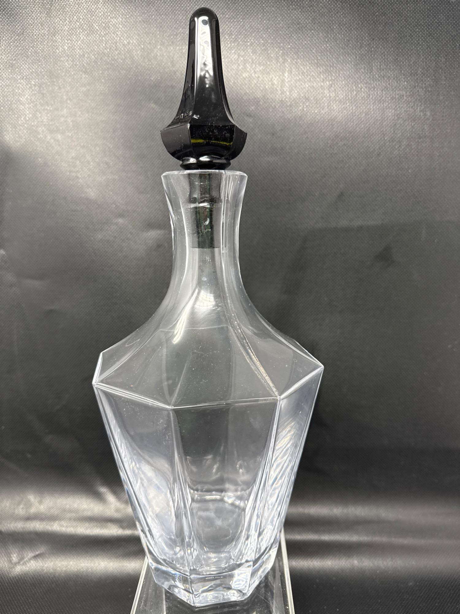 This elegant Cartier crystal decanter is a striking blend of luxury and craftsmanship. Featuring sharp geometric faceting and a tall, graceful silhouette, it’s designed to catch the light and attention in any setting. The decanter is paired with its original glossy black stopper, adding bold contrast and a refined finish. Features: Brand: Cartier Material: Fine crystal Stopper: Original black glass stopper Design: Geometric faceted body Color: Clear with black accent stopper Measurements: 13.5" tall x 5.5" wide