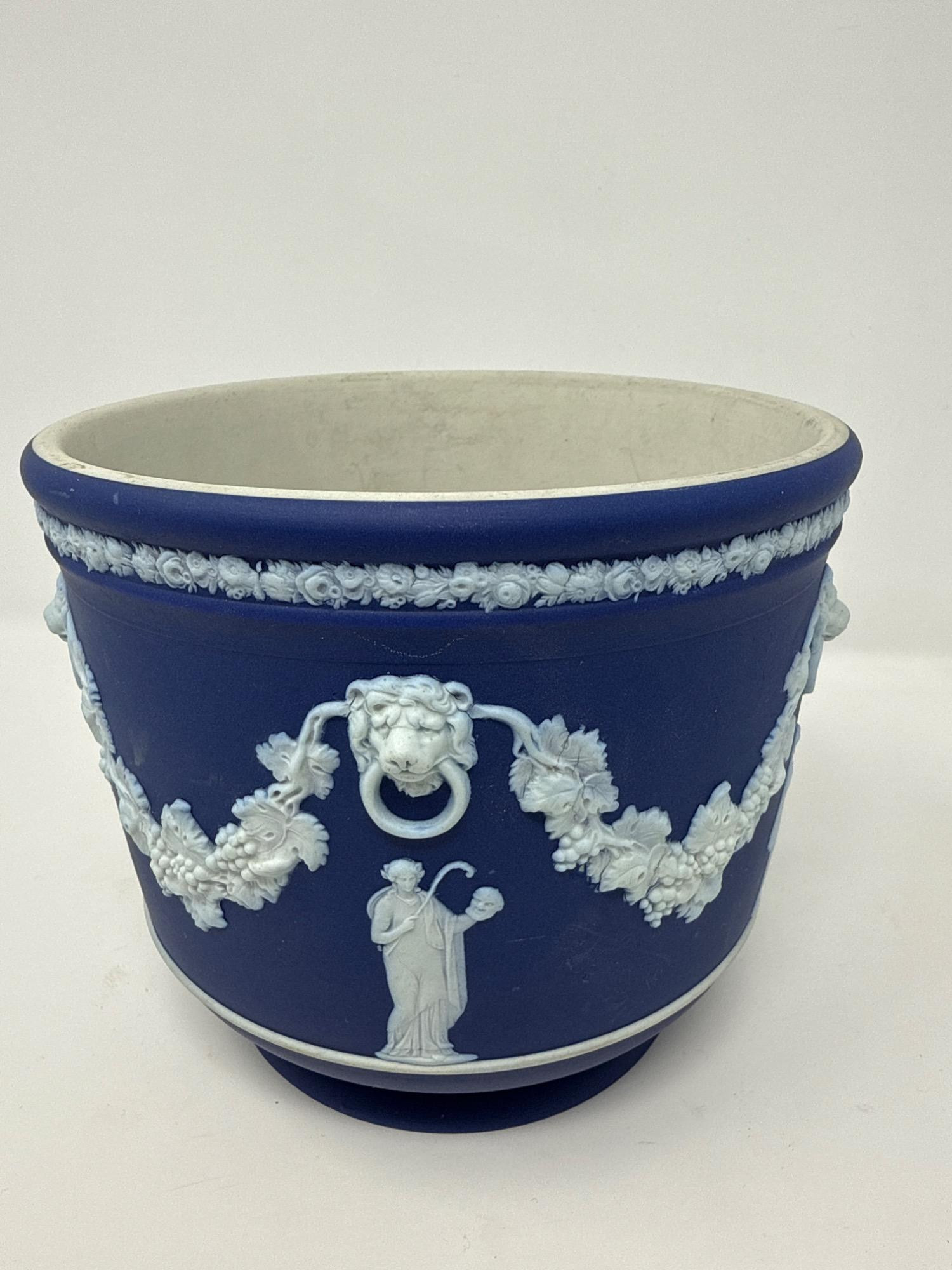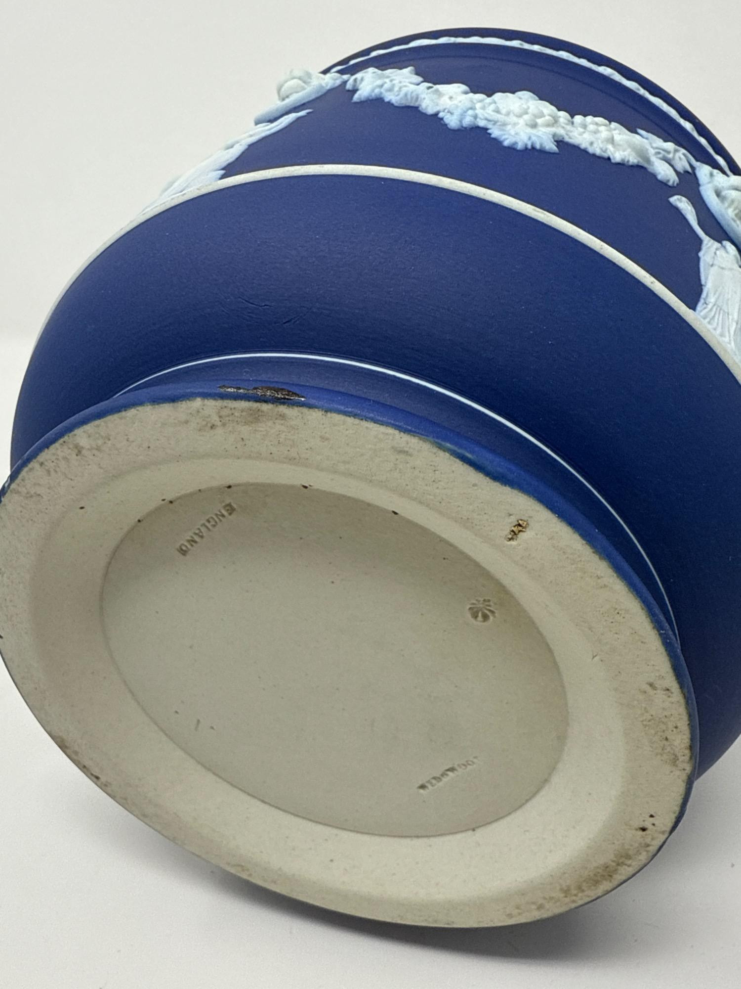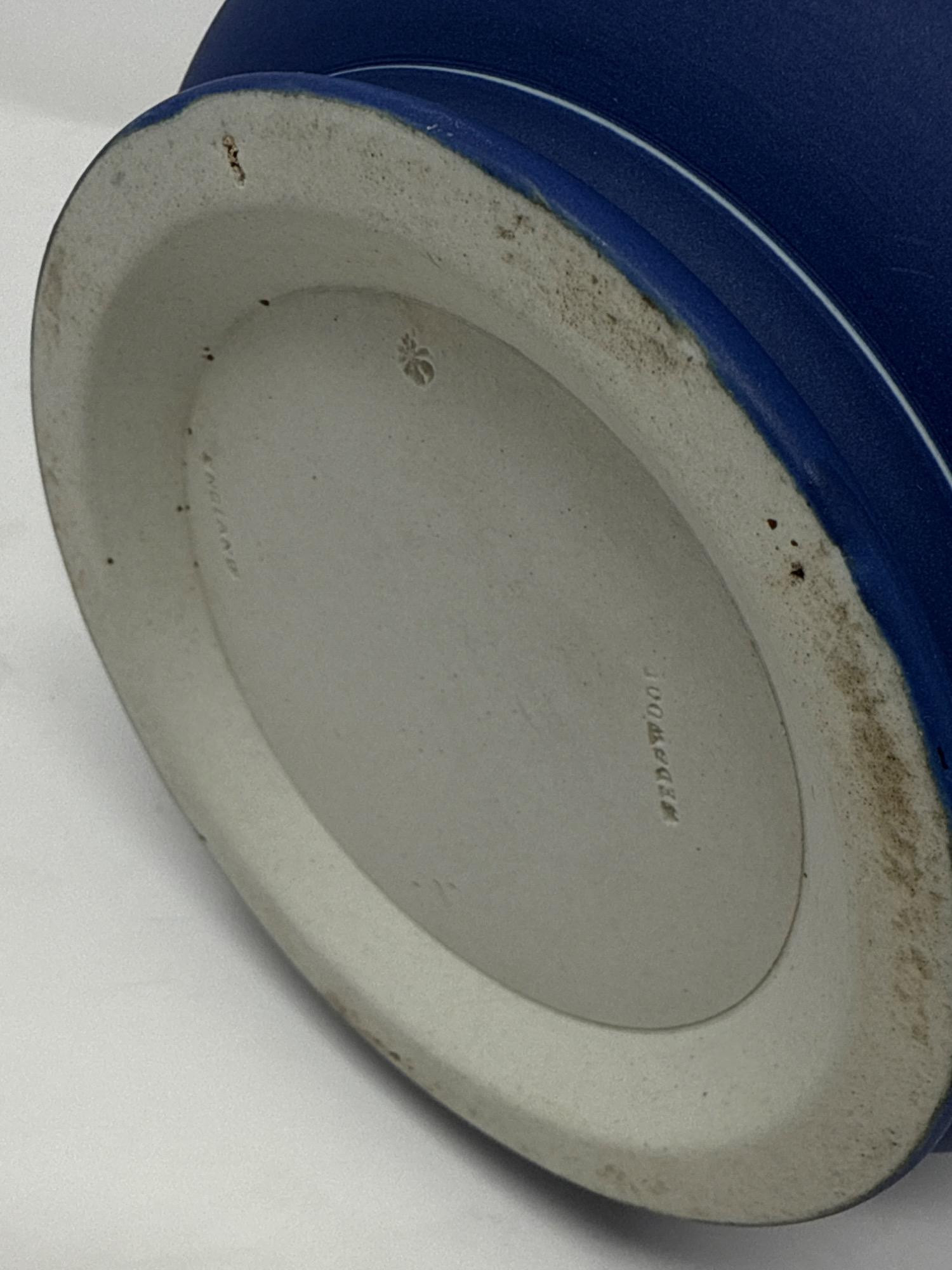 This stunning set includes a classic Wedgwood Jasperware ice bucket and matching shaker, showcasing the brand's iconic cobalt blue matte finish with raised white neoclassical reliefs. The delicate garlands, figures, and lion-head medallions are beautifully crafted in the traditional Wedgwood style. Ice Bucket Dimensions: 5 1/2" tall x 6" wide Shaker Dimensions: 5 1/2" tall x 2 1/2" wide at the base Material: Jasperware ceramic with metal shaker top