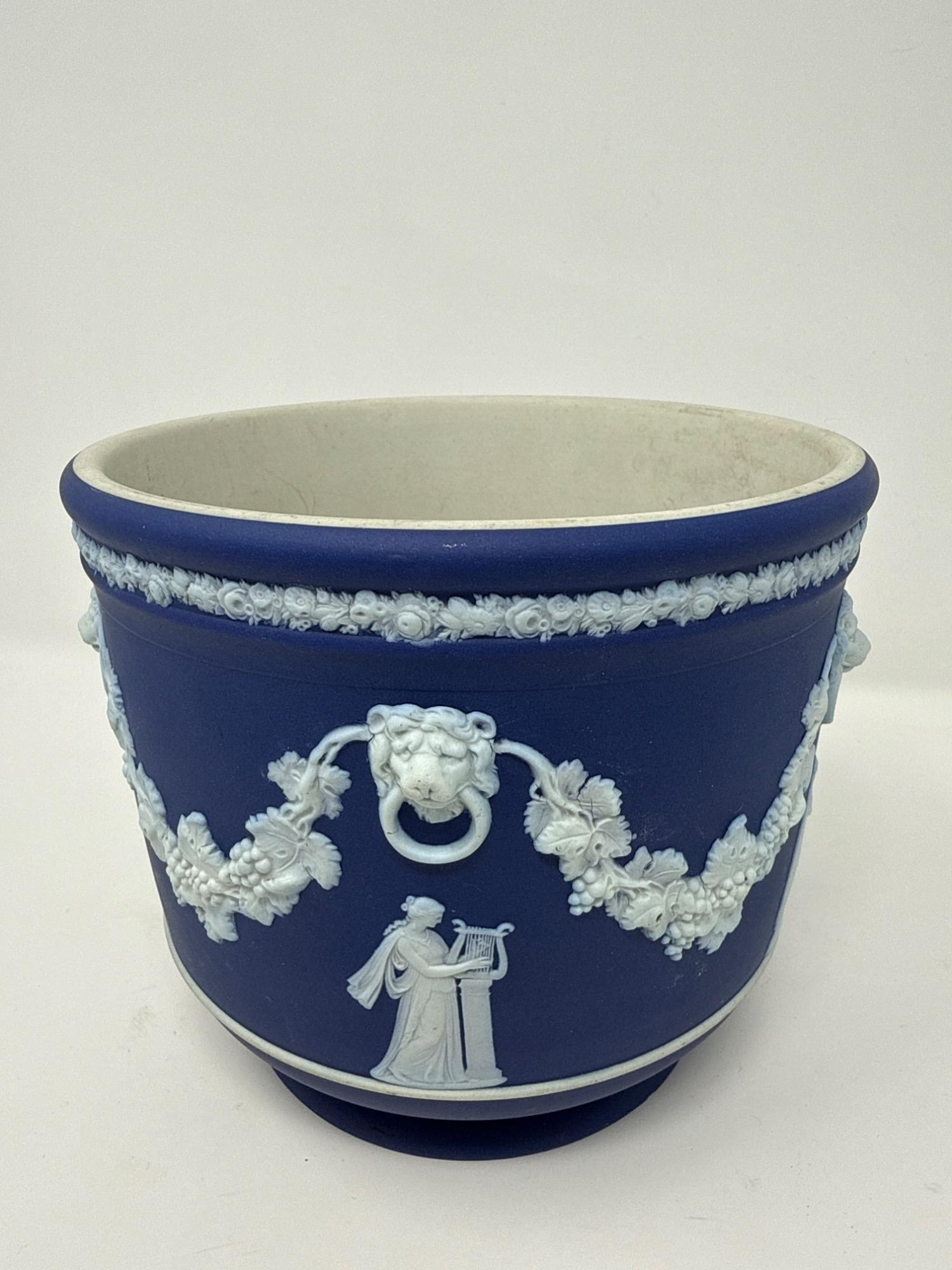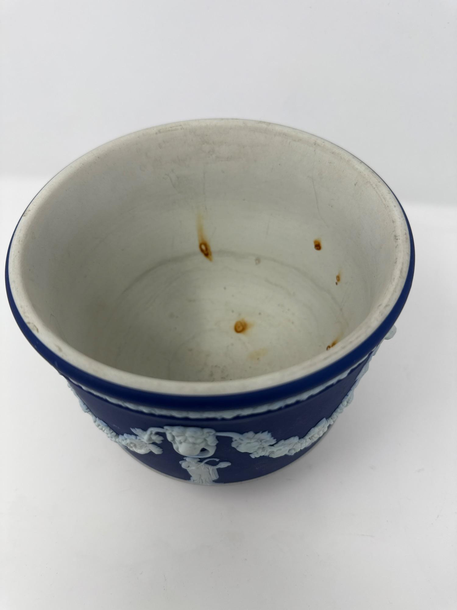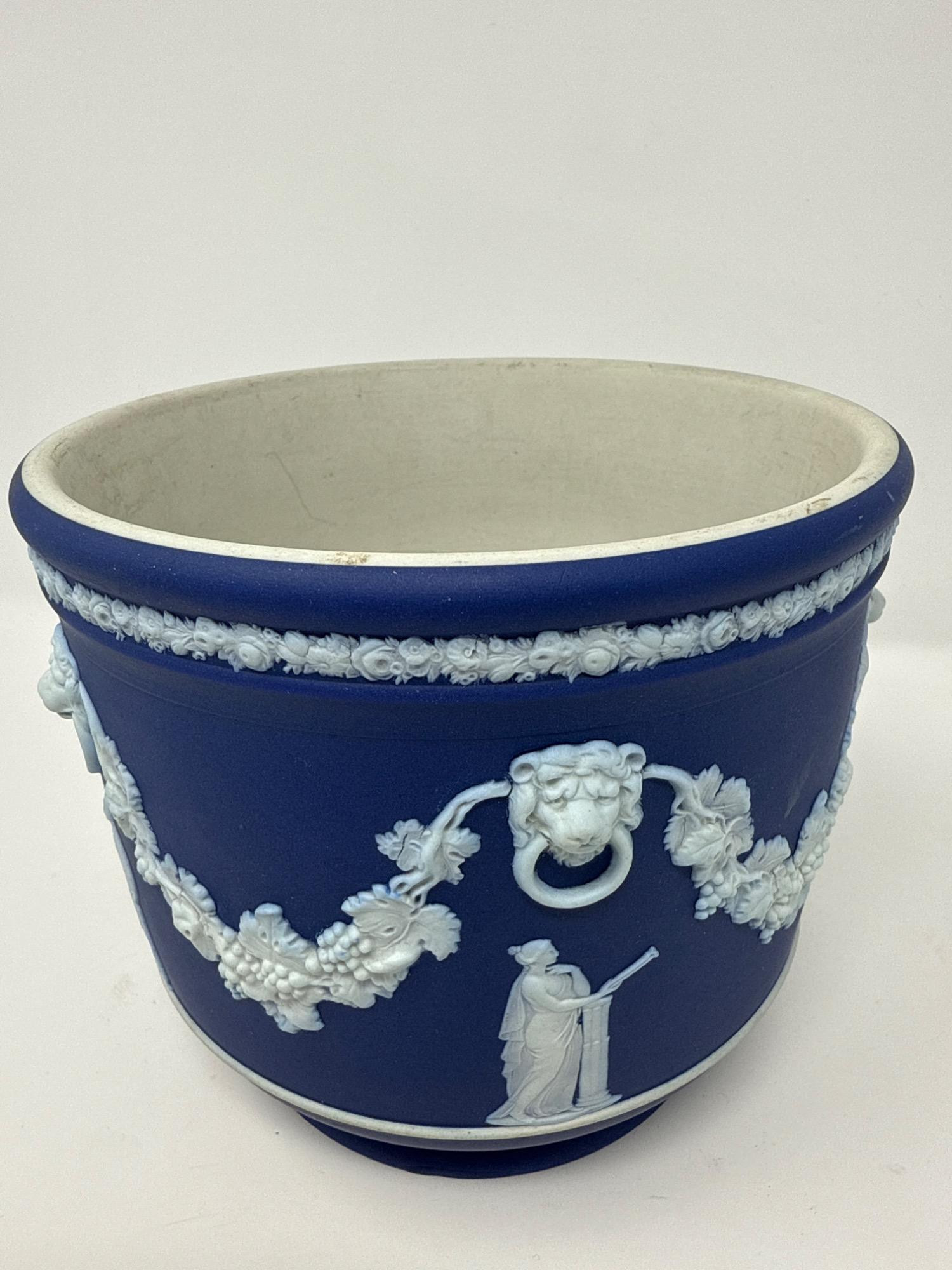 This stunning set includes a classic Wedgwood Jasperware ice bucket and matching shaker, showcasing the brand's iconic cobalt blue matte finish with raised white neoclassical reliefs. The delicate garlands, figures, and lion-head medallions are beautifully crafted in the traditional Wedgwood style. Ice Bucket Dimensions: 5 1/2" tall x 6" wide Shaker Dimensions: 5 1/2" tall x 2 1/2" wide at the base Material: Jasperware ceramic with metal shaker top