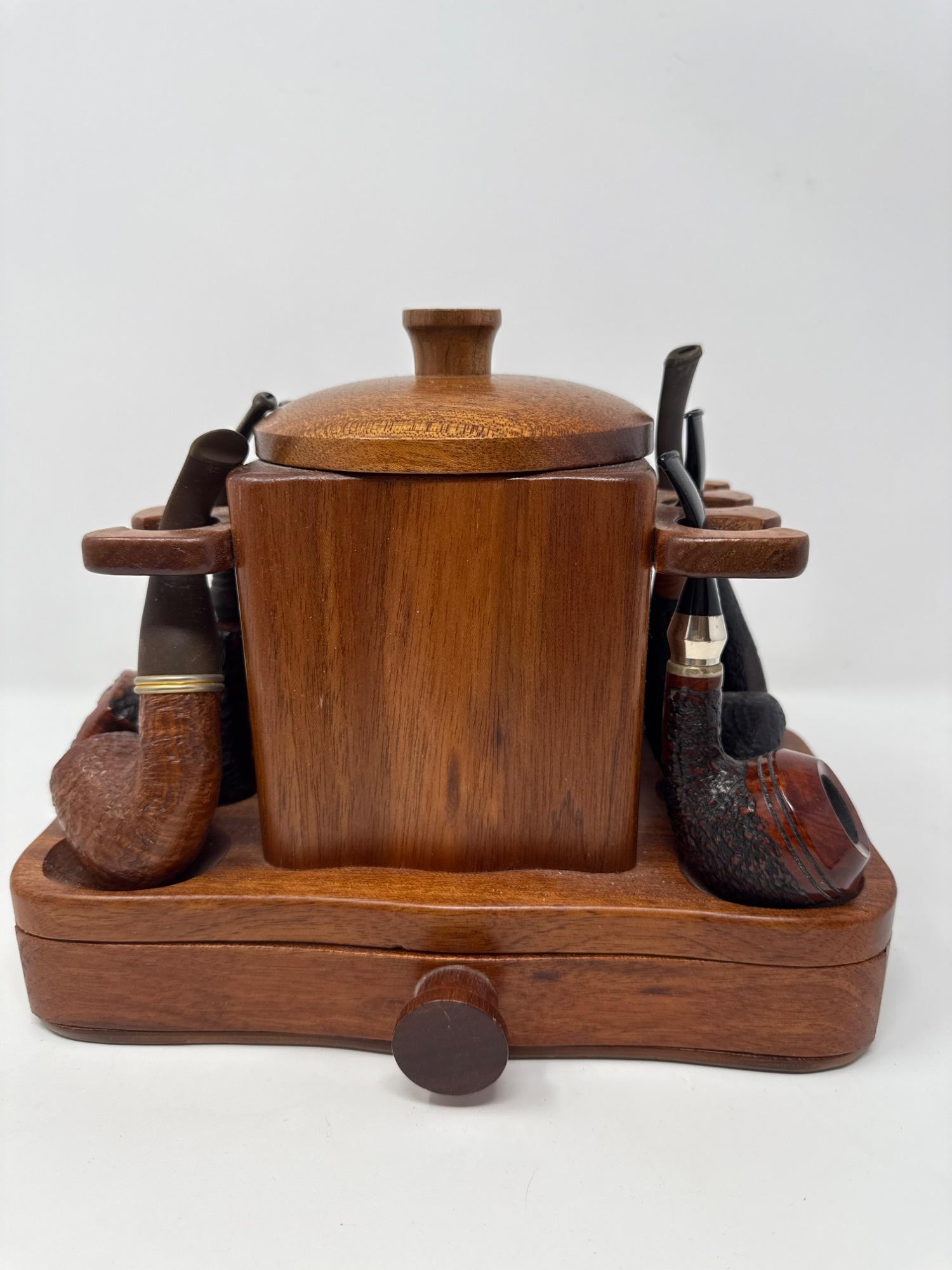 This is a beautifully crafted vintage wooden tobacco humidor with an integrated pipes rack. The piece features a rich wood grain finish and a classic design, making it both functional and decorative for any tobacco pipe enthusiast. Central Humidor: The ceramic-lined humidor sits at the center with a wooden lid featuring a built-in humidifier on the underside. It’s perfect for storing pipe tobacco and maintaining freshness. Pipe Rack: Surrounding the humidor are 10 slots to securely hold standard-size smoking pipes. Accessory Drawer: The bottom portion includes a pull-out drawer ideal for storing cutters, lighters, matches, filters, or other pipe and cigar accessories. Dimensions: 10" Wide x 8" Tall
